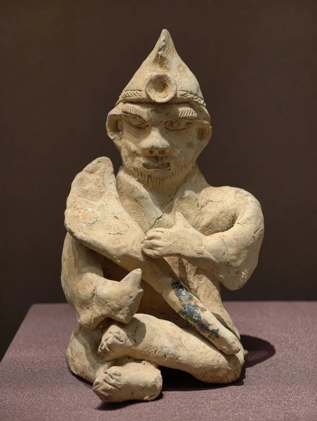 戴尖角帽的胡人形象源自欧亚草原上的斯基泰文化。这种形象在我国先秦至秦汉时期的文物上多有出现。两汉魏晋时期,此类形象既有表现与求仙西方相关的题材,也有表现现实生活中的胡人仆役,这件瓷俑属于后者。