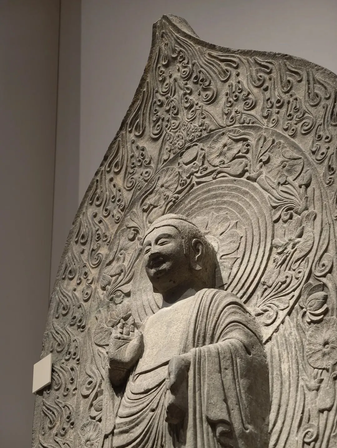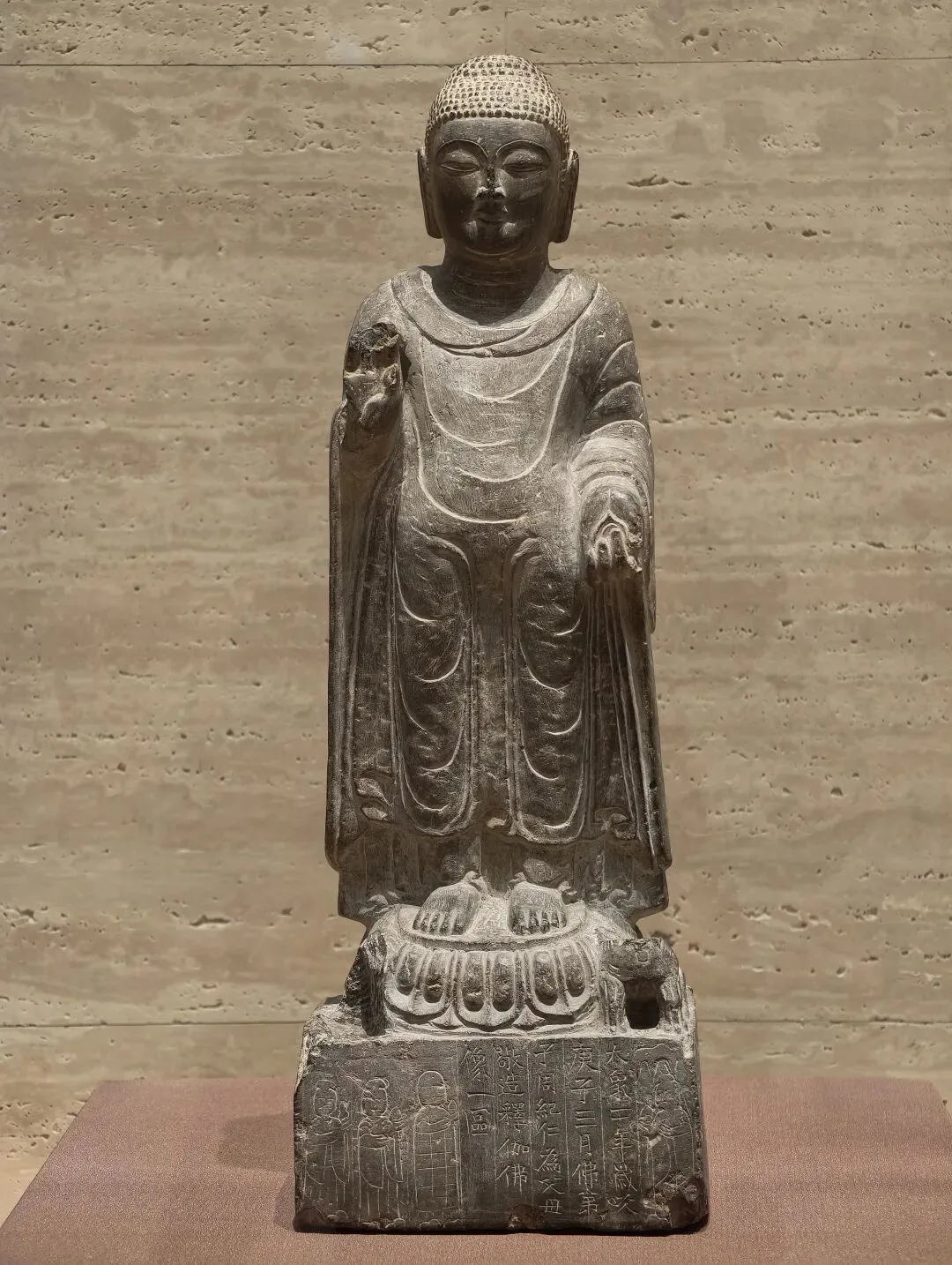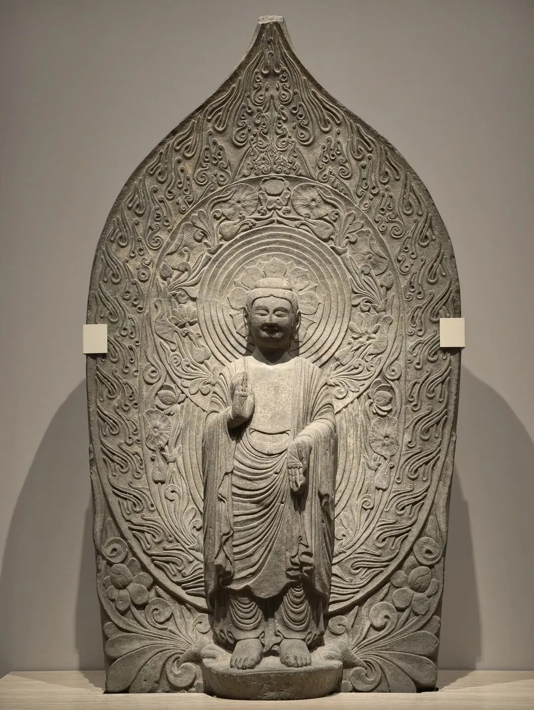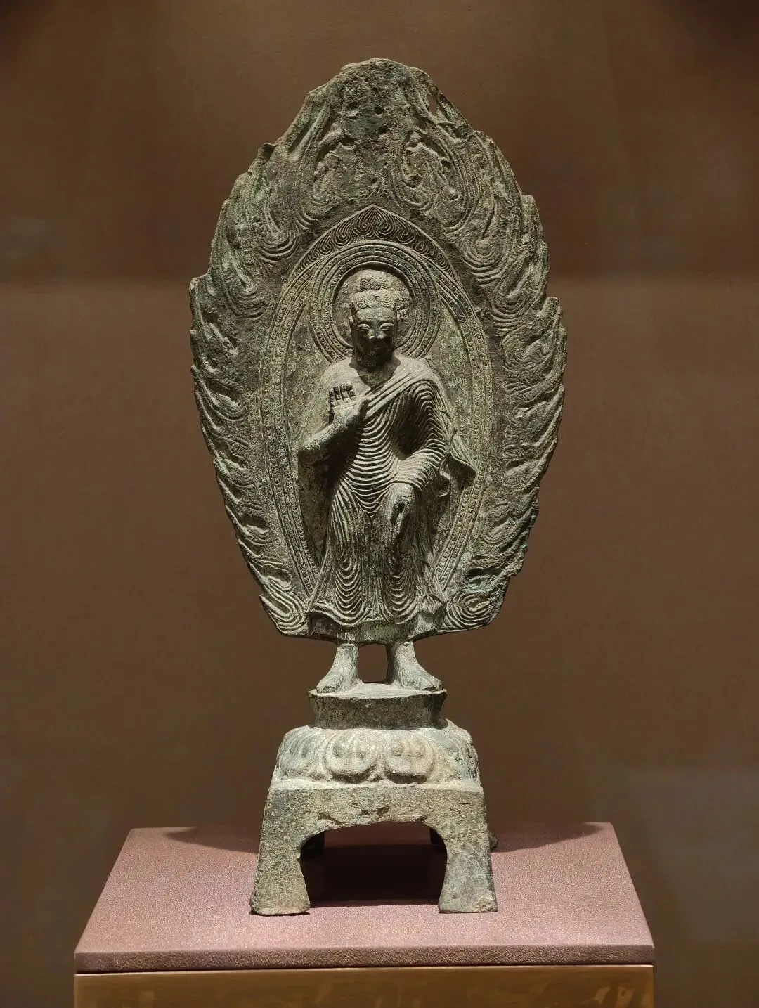 佛像波浪状的发纹在正面形成旋涡,右手上举胸前施无畏印,左手下垂腰胯处。着袒裸右肩式袈裟,衣纹密集贴体,双腿直立。背光外围火焰纹富有张力。佛像具有北魏早中期雄强的风格,受到了中亚和印度笈多艺术影响。