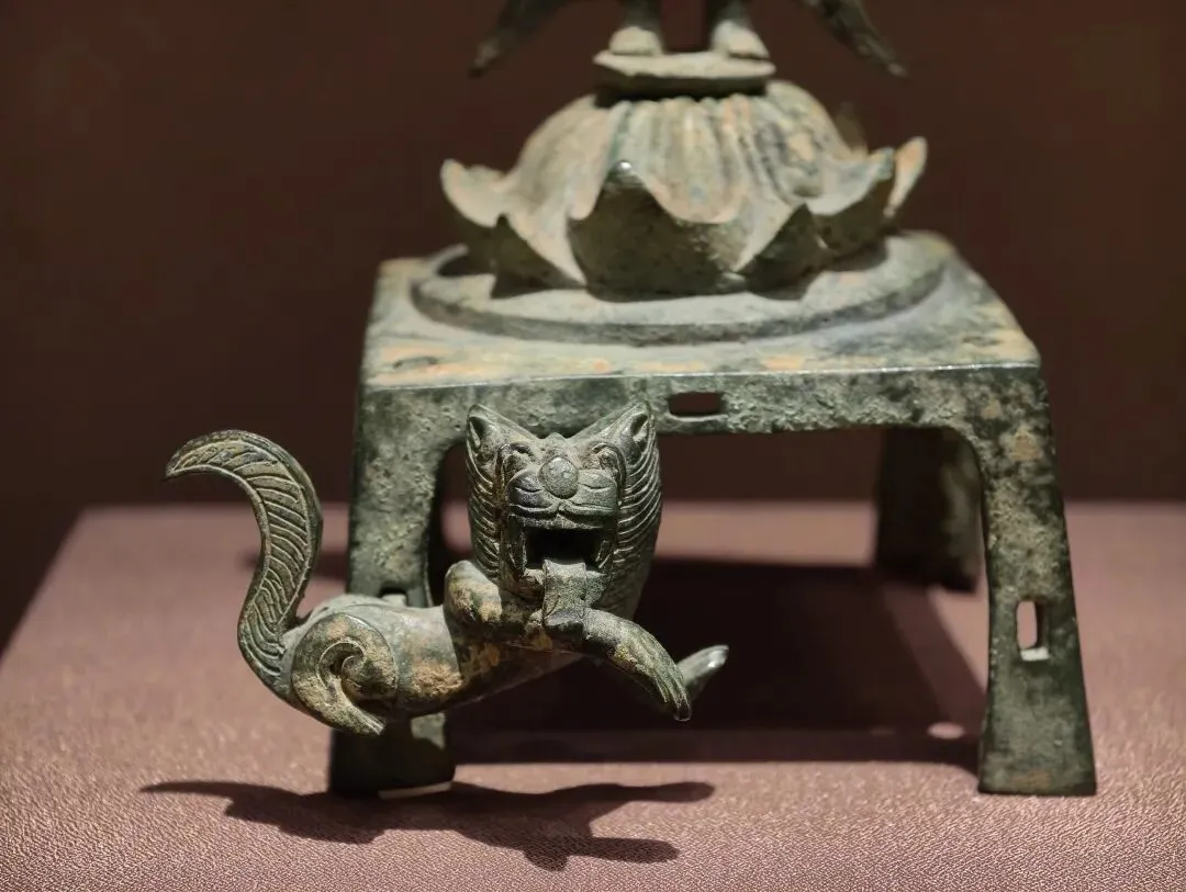 摇钱树是东汉墓葬中的一种陪葬品,多出土于川渝地区,具有祈求富贵与成仙等多重含义。树顶有坐在龙虎座上的西王母,她被认为是掌管人升天成仙的神仙,住在世界最西方的昆仑山上。有意思的是,在下方的树干上有一尊受贵霜王朝犍陀罗艺术影响的佛像,表明受到了丝路交流的影响。当时人认为,佛与西王母均为来自西方的神仙。