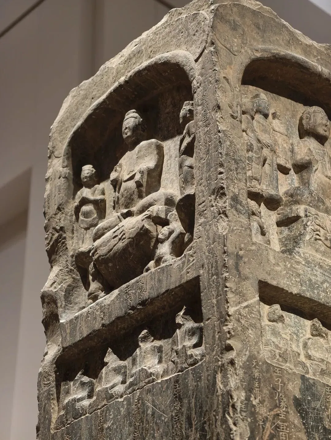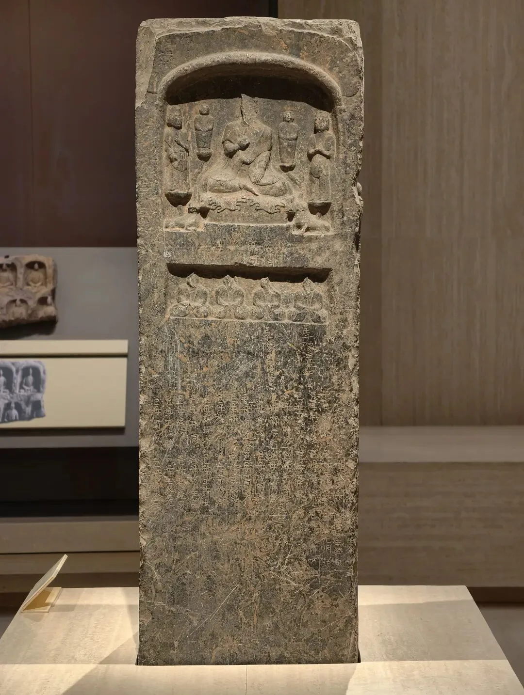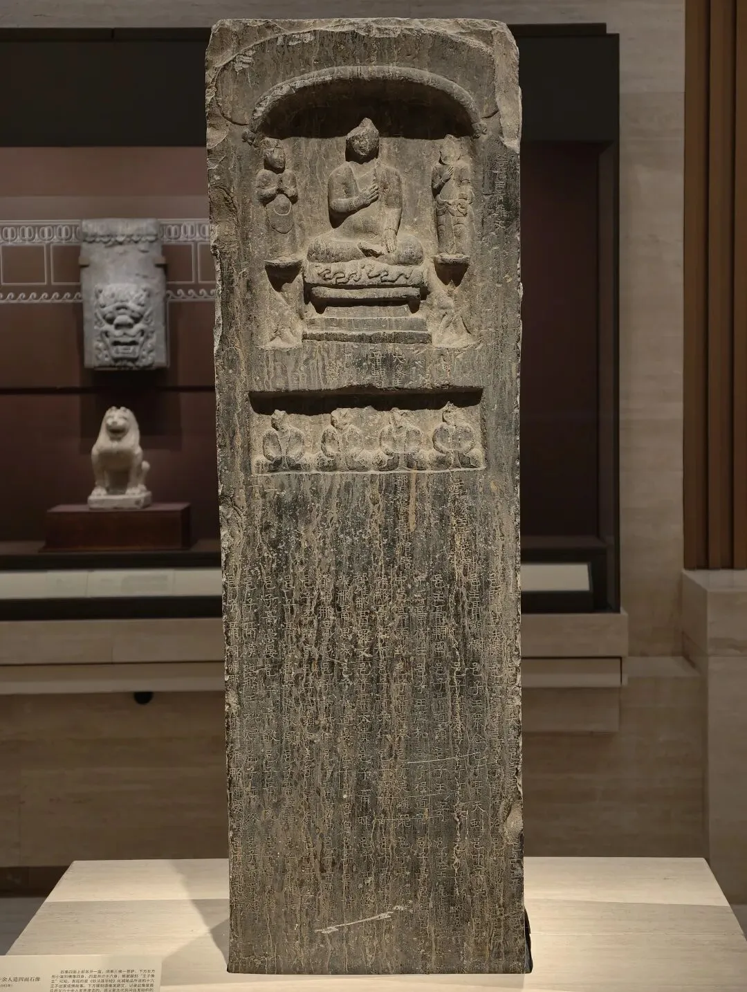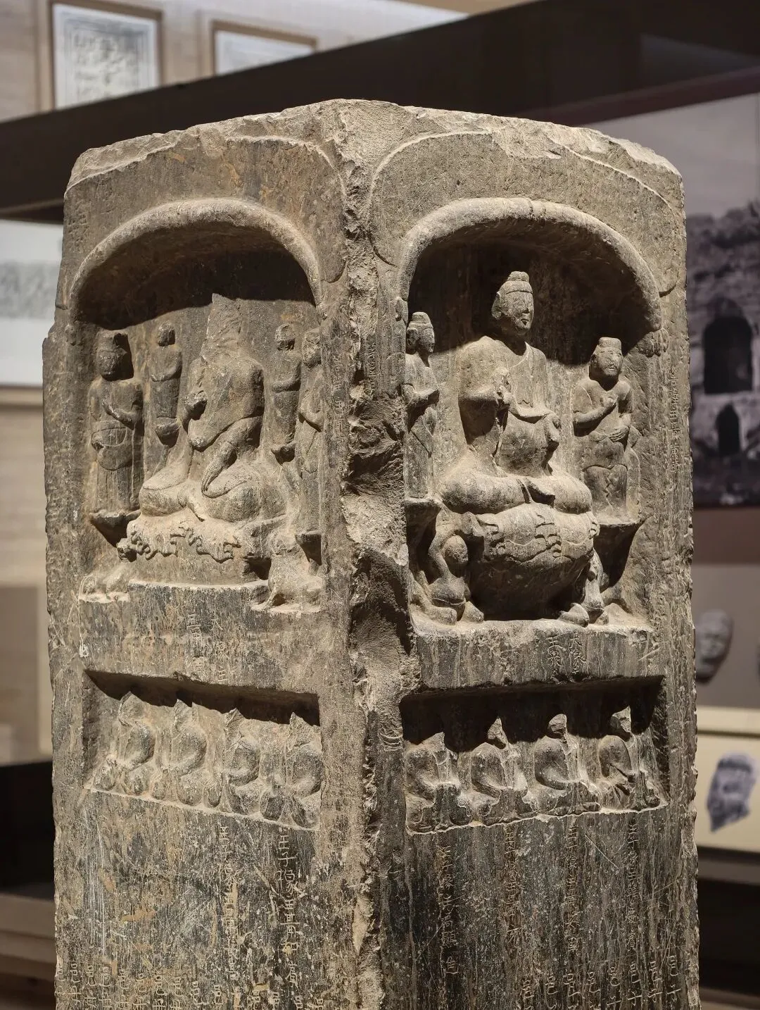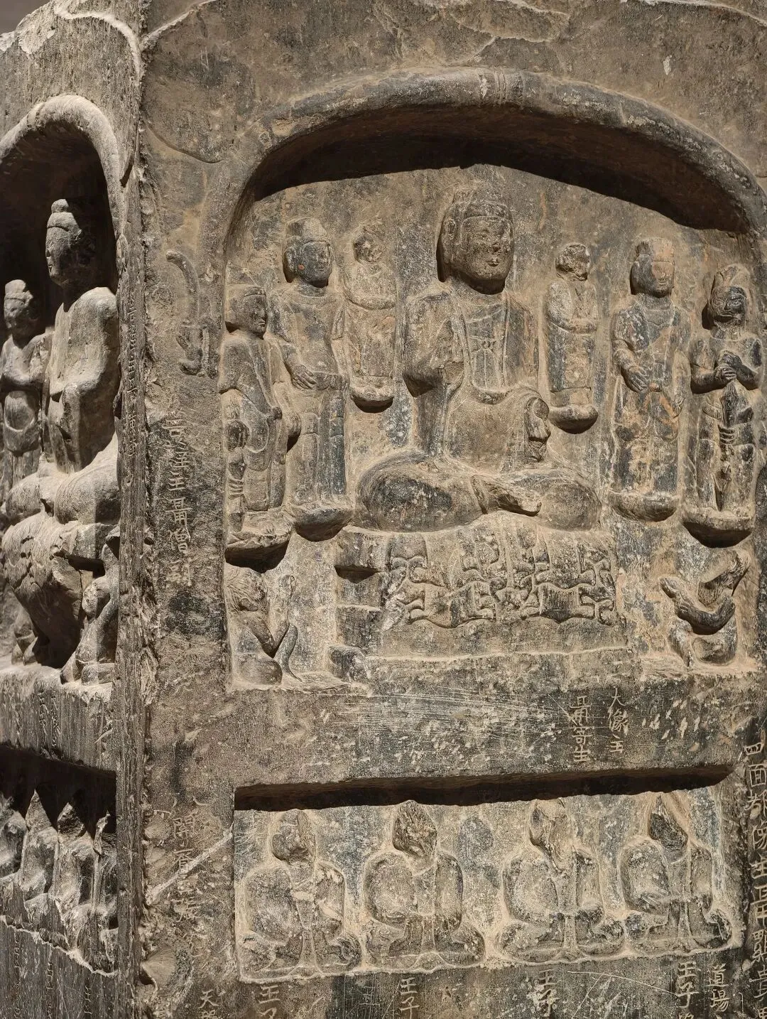 石像四面上部各开一龛,供奉三佛一菩萨,下方长方形小龛刻佛像四身,四面共计十六身,根据题刻 “王子像主” 可知,表现的是《妙法莲华经》化城喻品所说的十六王子出家成佛故事。下方锲刻造像发愿文,记录此像是聂氏邑义六十余人发愿建造的。邑义是古代民间自发组织的佛教信仰团体,多由地缘和血缘关系相近的人组成。