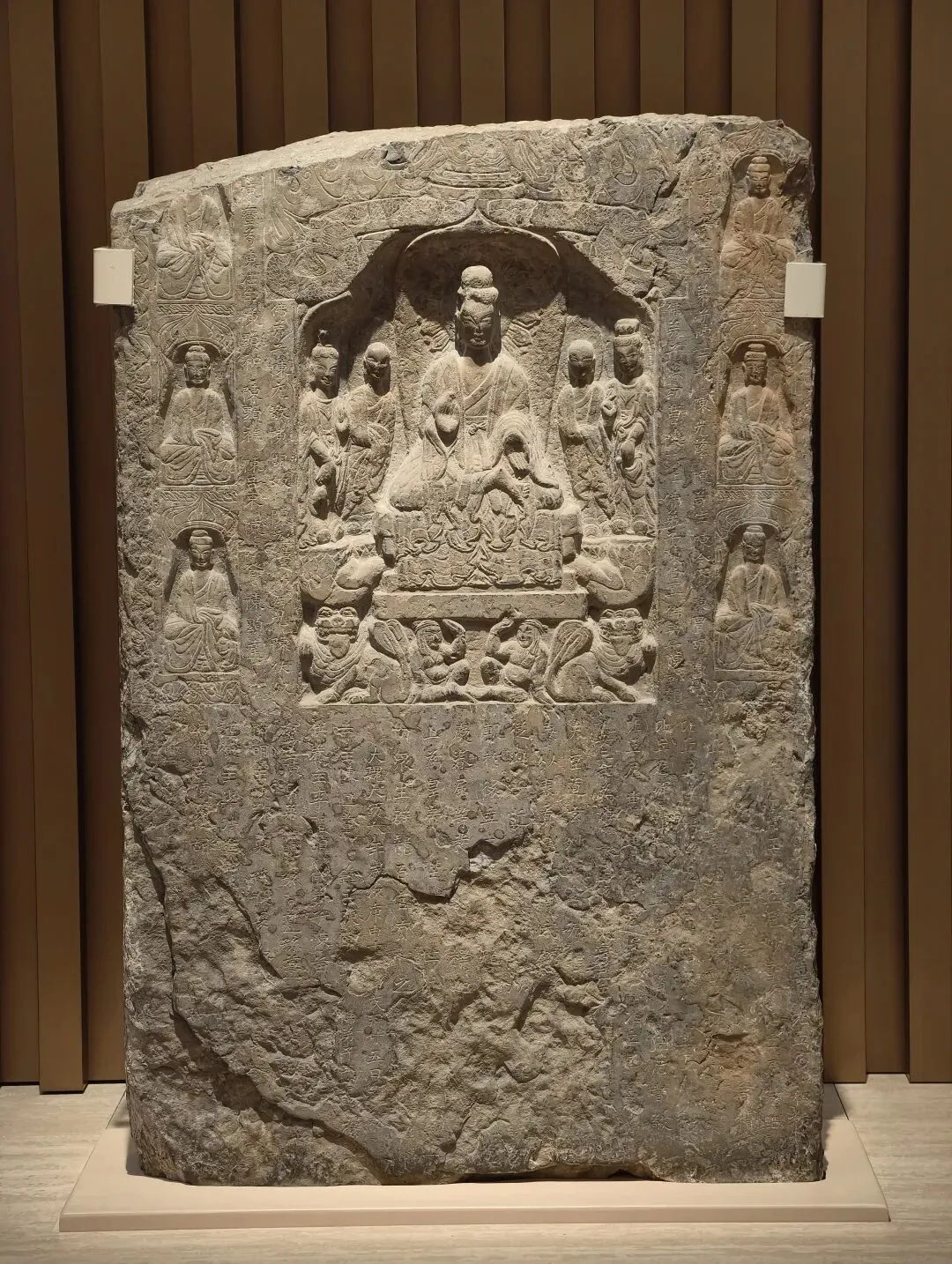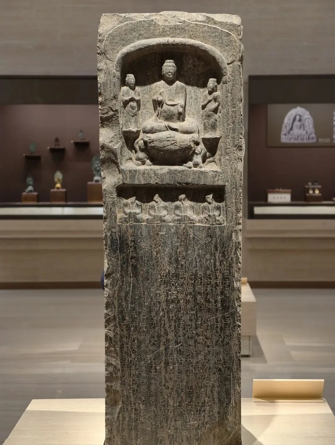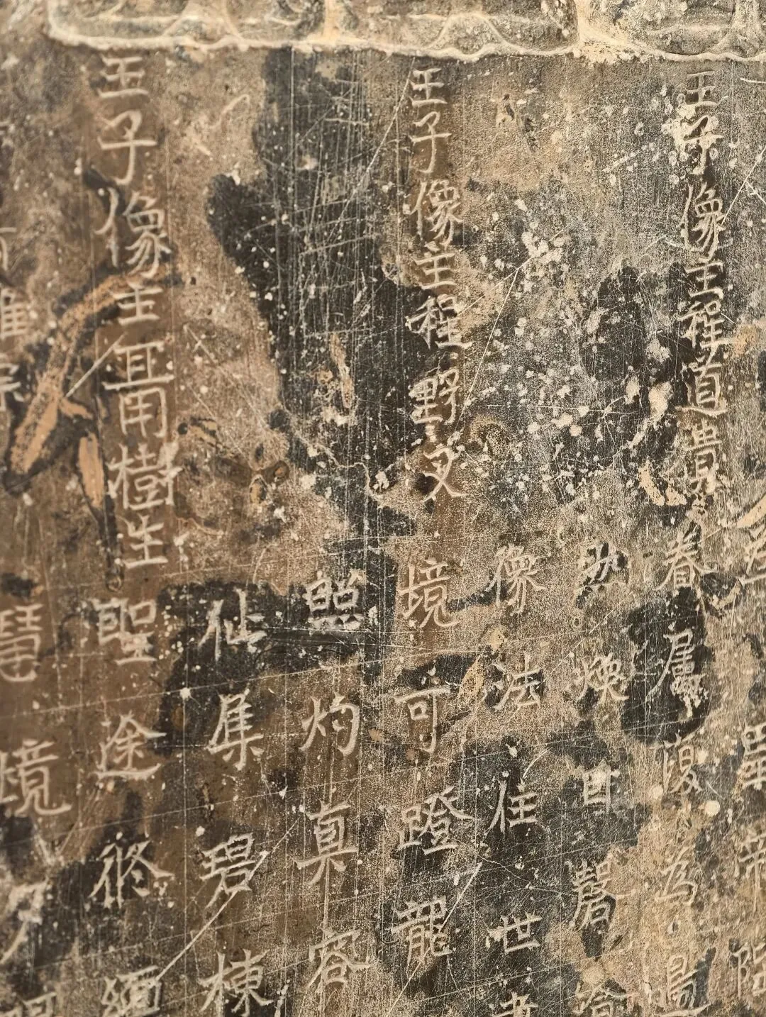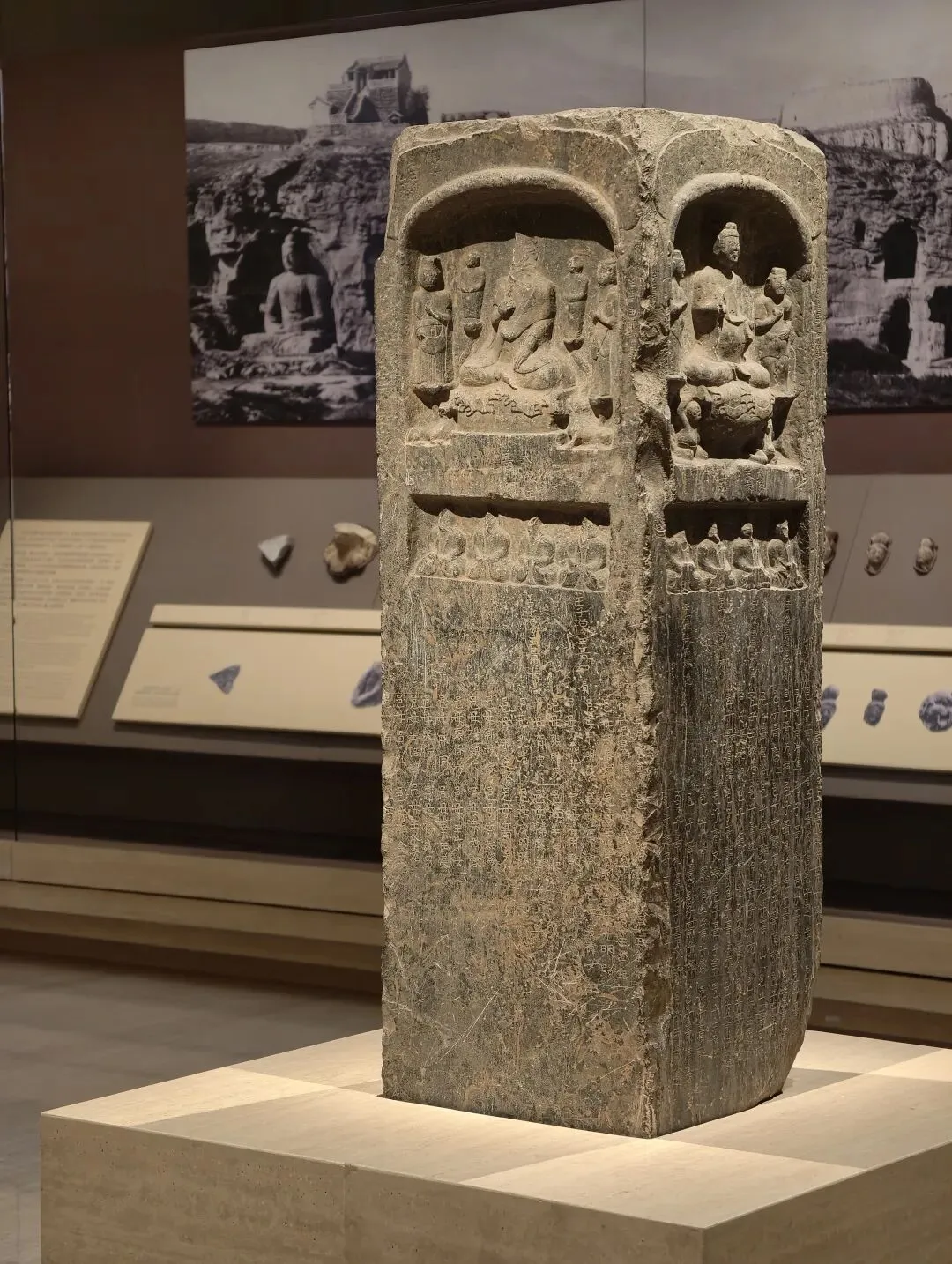 石像四面上部各开一龛,供奉三佛一菩萨,下方长方形小龛刻佛像四身,四面共计十六身,根据题刻 “王子像主” 可知,表现的是《妙法莲华经》化城喻品所说的十六王子出家成佛故事。下方锲刻造像发愿文,记录此像是聂氏邑义六十余人发愿建造的。邑义是古代民间自发组织的佛教信仰团体,多由地缘和血缘关系相近的人组成。