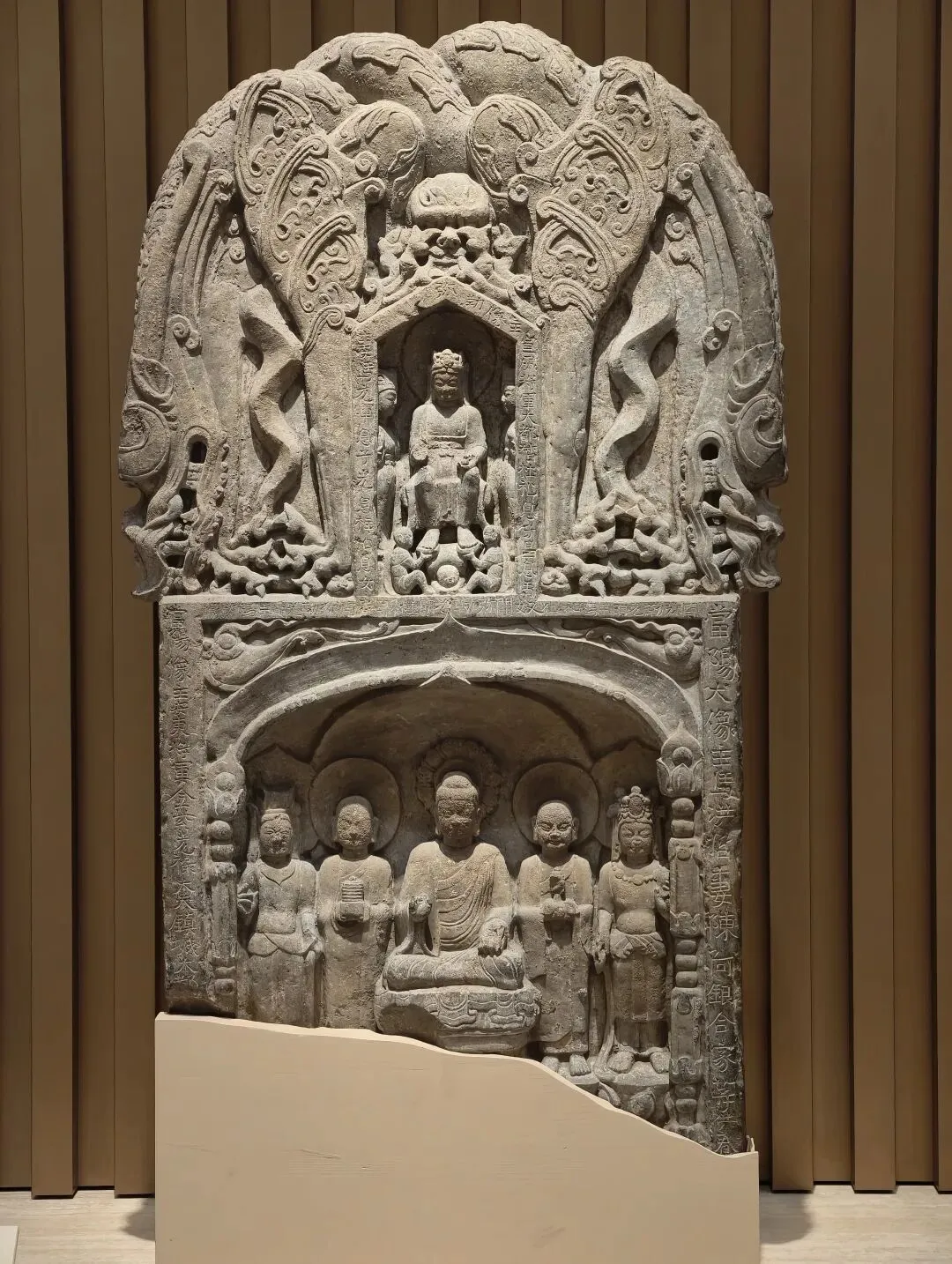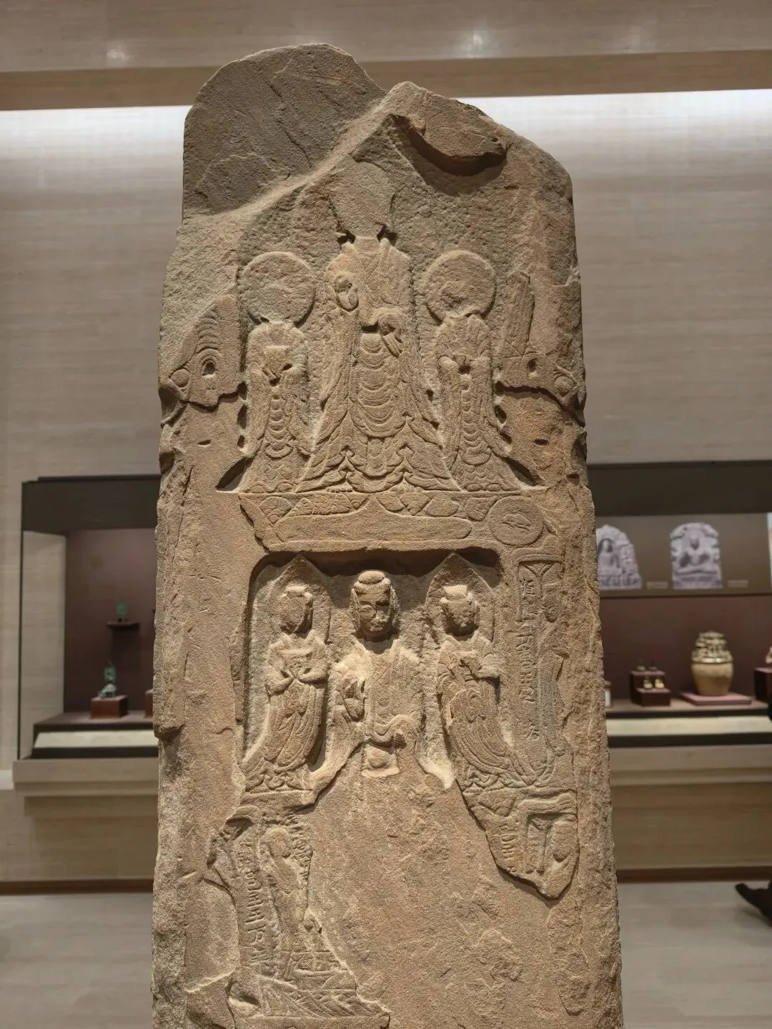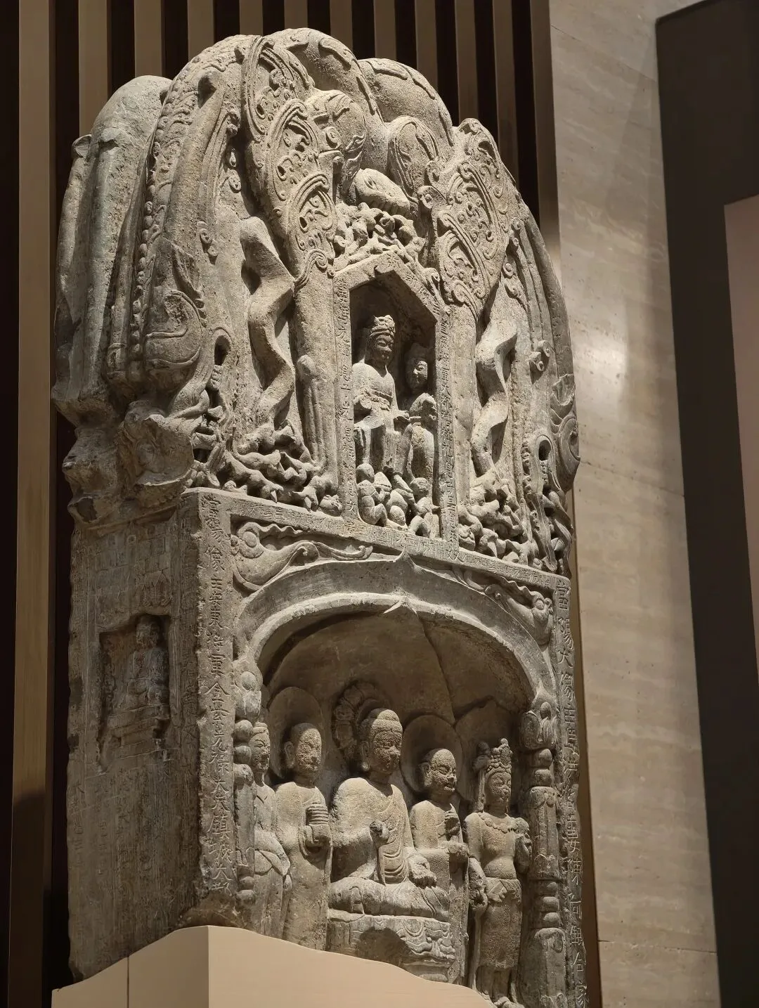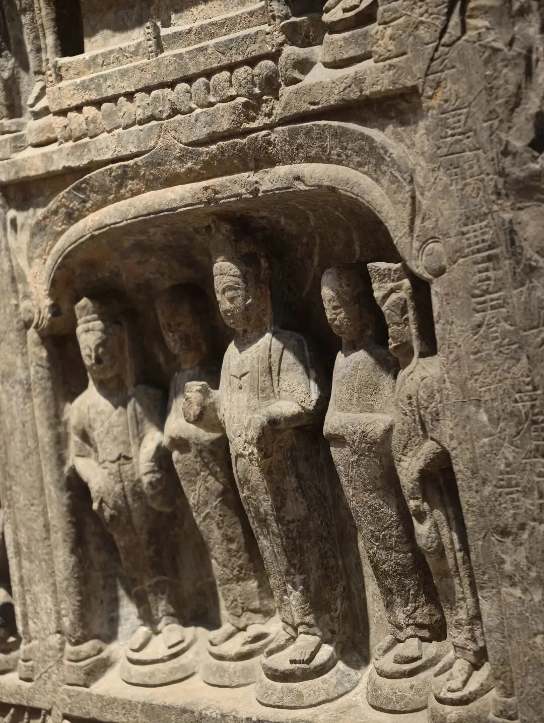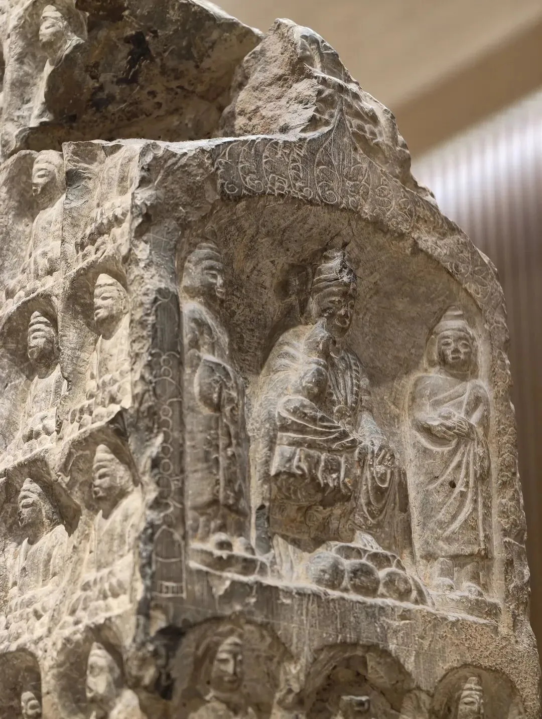 石像四面上部各开一龛,供奉三佛一菩萨,下方长方形小龛刻佛像四身,四面共计十六身,根据题刻 “王子像主” 可知,表现的是《妙法莲华经》化城喻品所说的十六王子出家成佛故事。下方锲刻造像发愿文,记录此像是聂氏邑义六十余人发愿建造的。邑义是古代民间自发组织的佛教信仰团体,多由地缘和血缘关系相近的人组成。