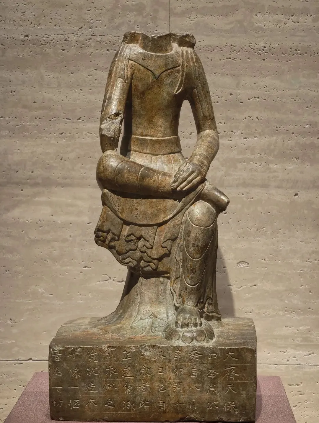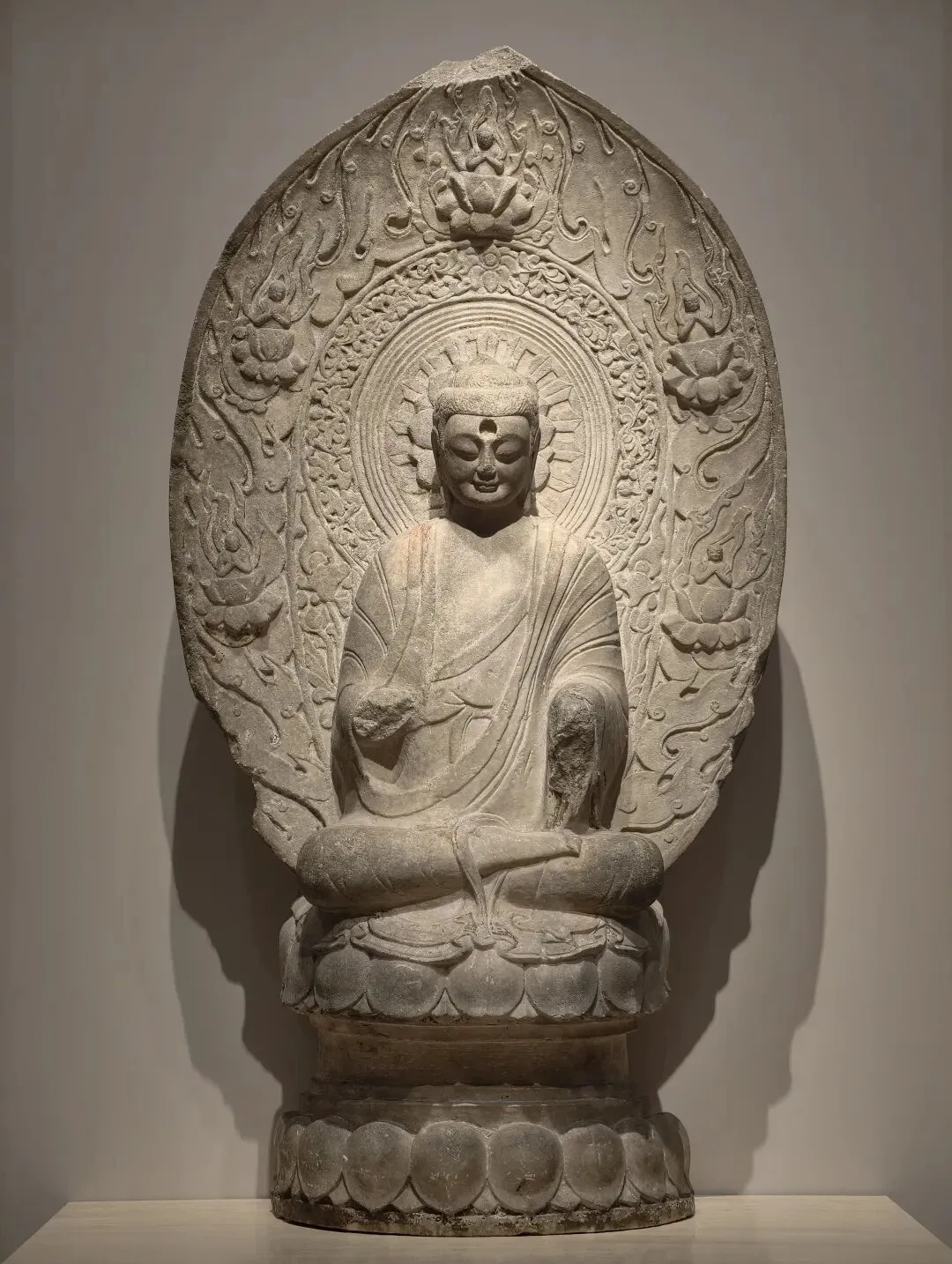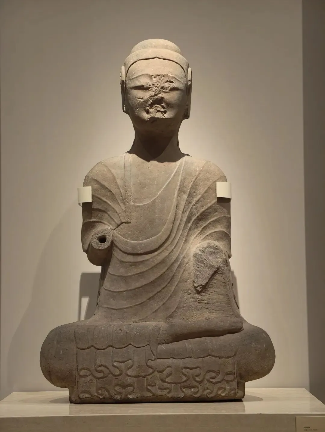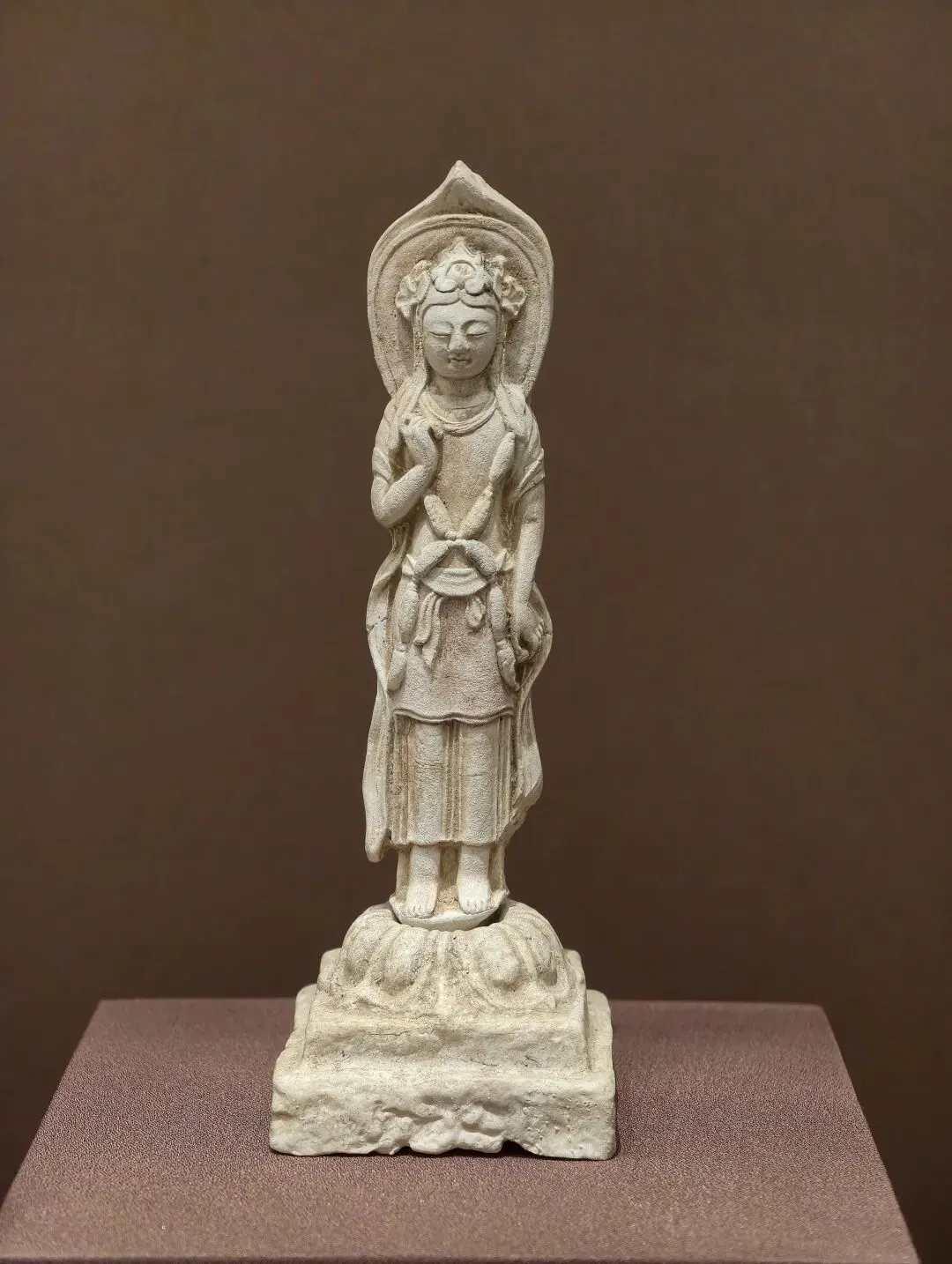 此造像用石灰岩雕刻,面部宁静含蓄,长颈削肩,体现出南朝造像秀骨清像的特征。现存南朝单体造像多出于四川成都及岷江上游地区,此尊造像源自长江下游地区南朝齐、梁之际,因此显得尤为珍贵。