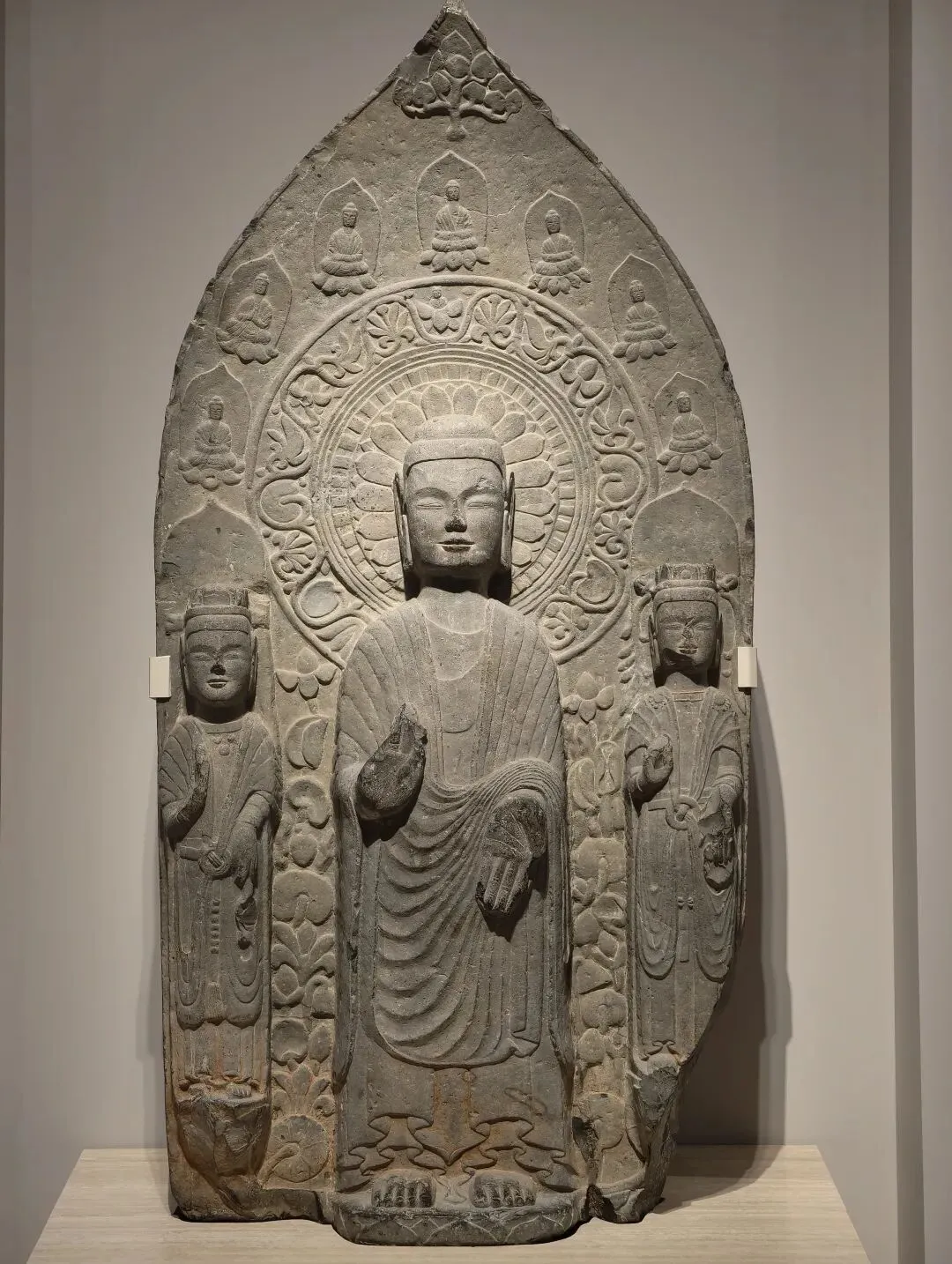 南朝造像到萧梁时期达到鼎盛,出现大型及等身圆雕造像。萧梁造像面型圆润,身着 “褒衣博带” 式佛衣,下垂衣纹具有装饰性。头大身短,多为五头身,即所谓张僧繇 “面短而艳” 的艺术风格。萧梁时期由于陆上与海上丝路的畅通,特别是梁武帝时期,南朝与西域、南海诸国的往来颇达。在萧梁造像可见中亚、印度笈多等多种域外风格的影响。南朝通过海路联通朝鲜半岛的百济,并通过百济,对日本最初的佛教艺术 —— 飞鸟时代佛教雕塑产生深远的影响。