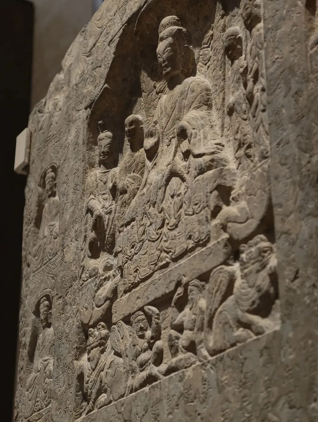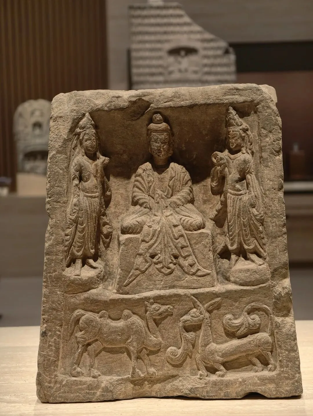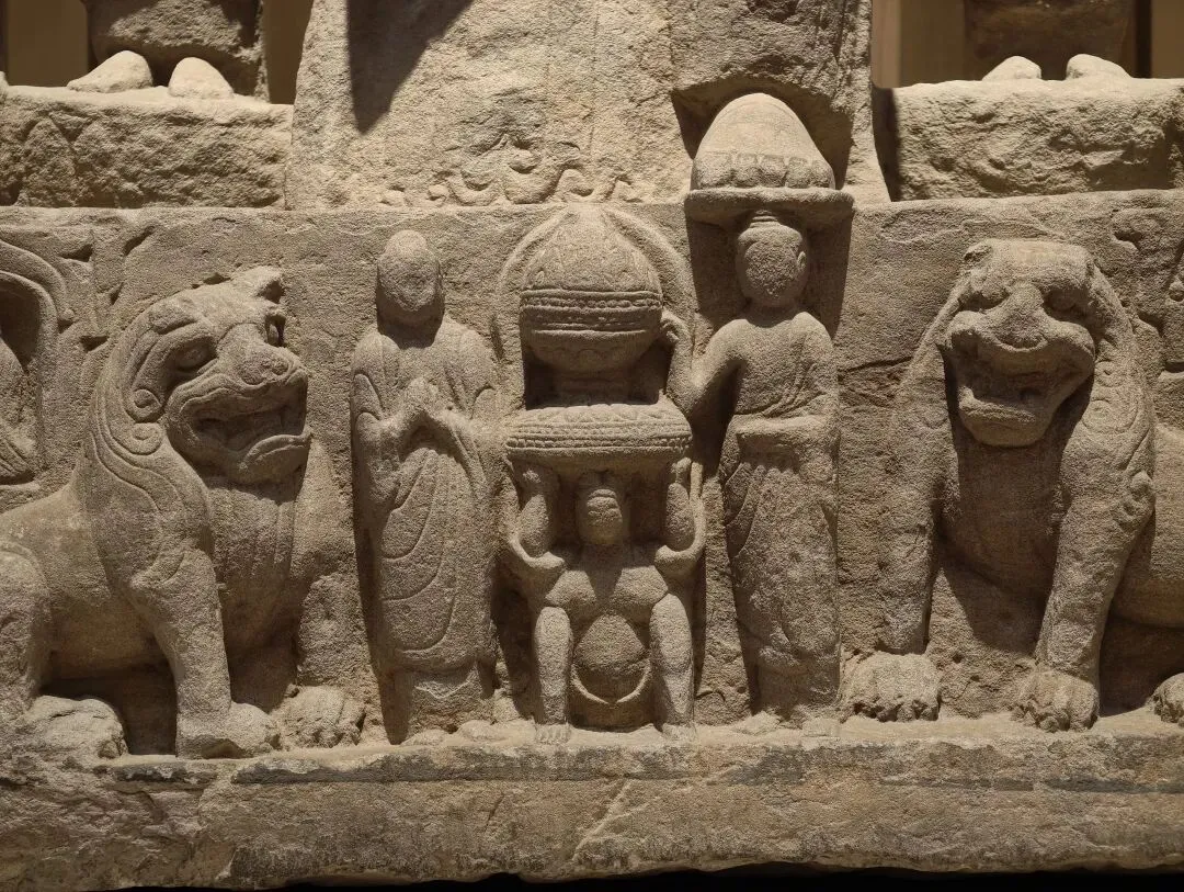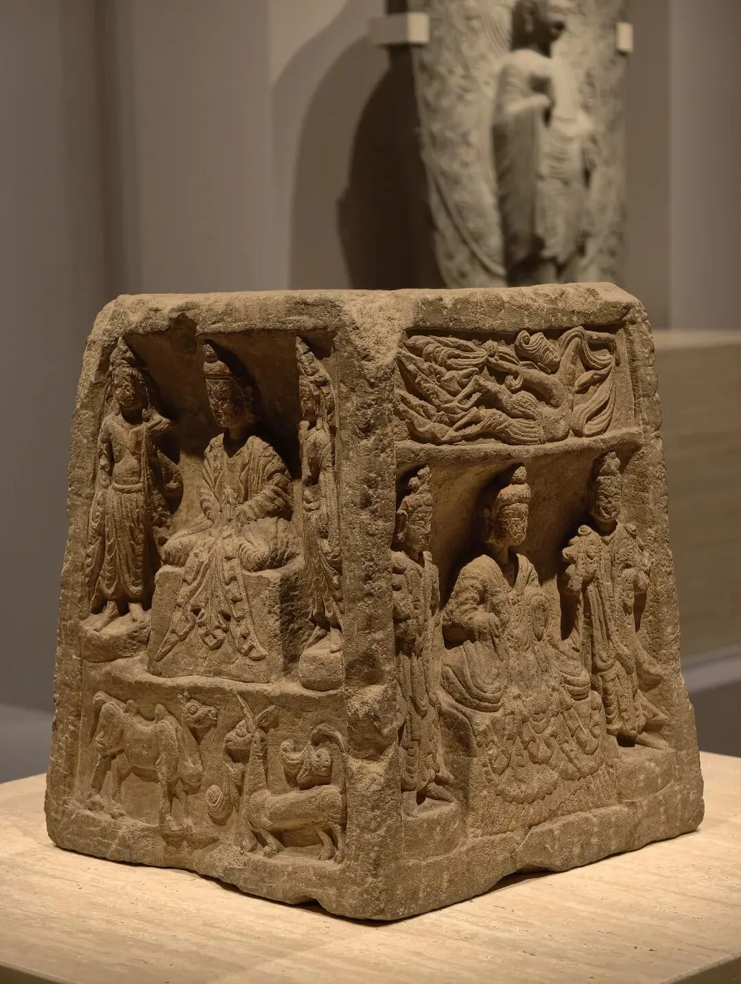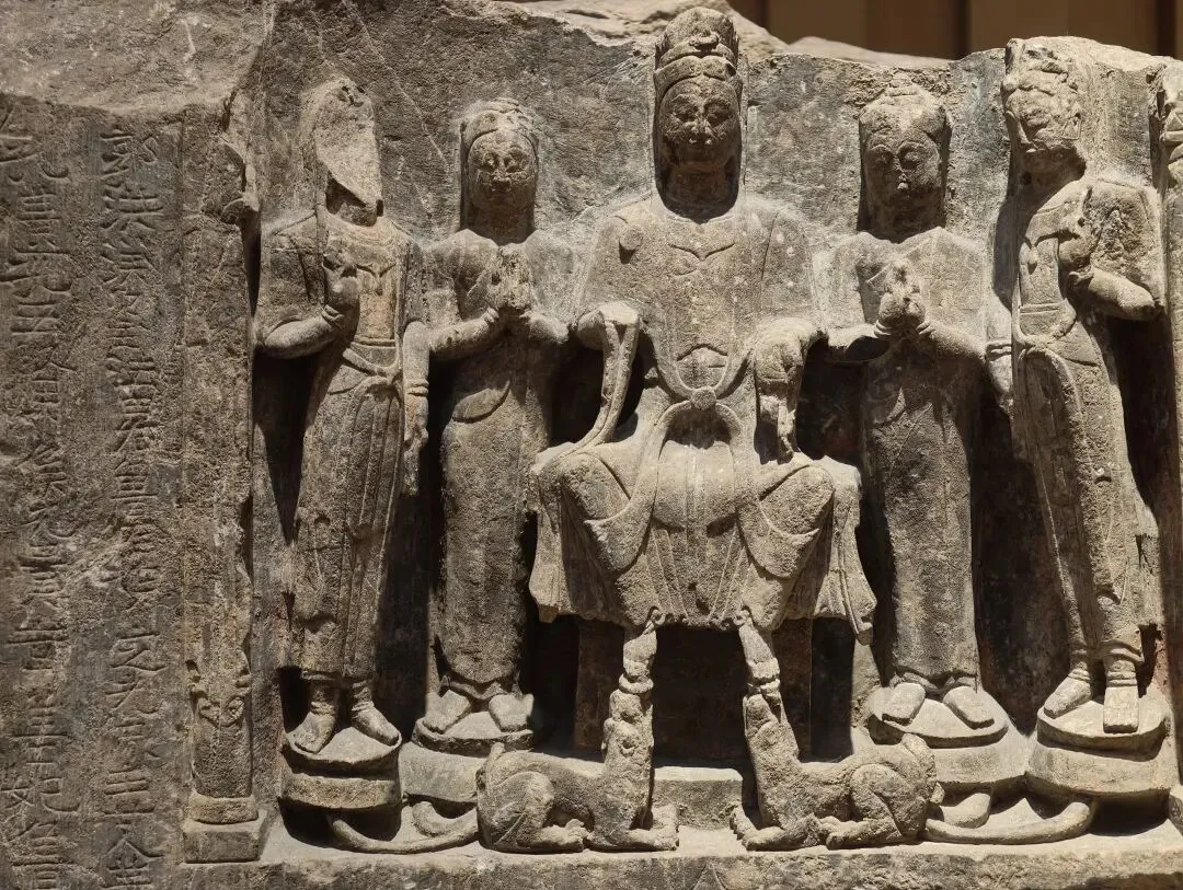出土石塔节的陇东地区是一处佛教雕塑艺术传播的十字路口。在这件石塔节上,既有身穿 “褒衣博带” 装的佛像,也有衣着贴体的凉州风格的佛像,尤其是菩萨像上身裸露、下身着裙,明显受到西域影响。中国式的佛装源自蜀地南朝齐风格,越过秦岭影响到陇东地区,体现了此地南北方向的交流。石塔节下方有龙、狮子、驴和骆驼等表示祥瑞的动物。这些动物在当时被认为是神兽,多从西域传来。