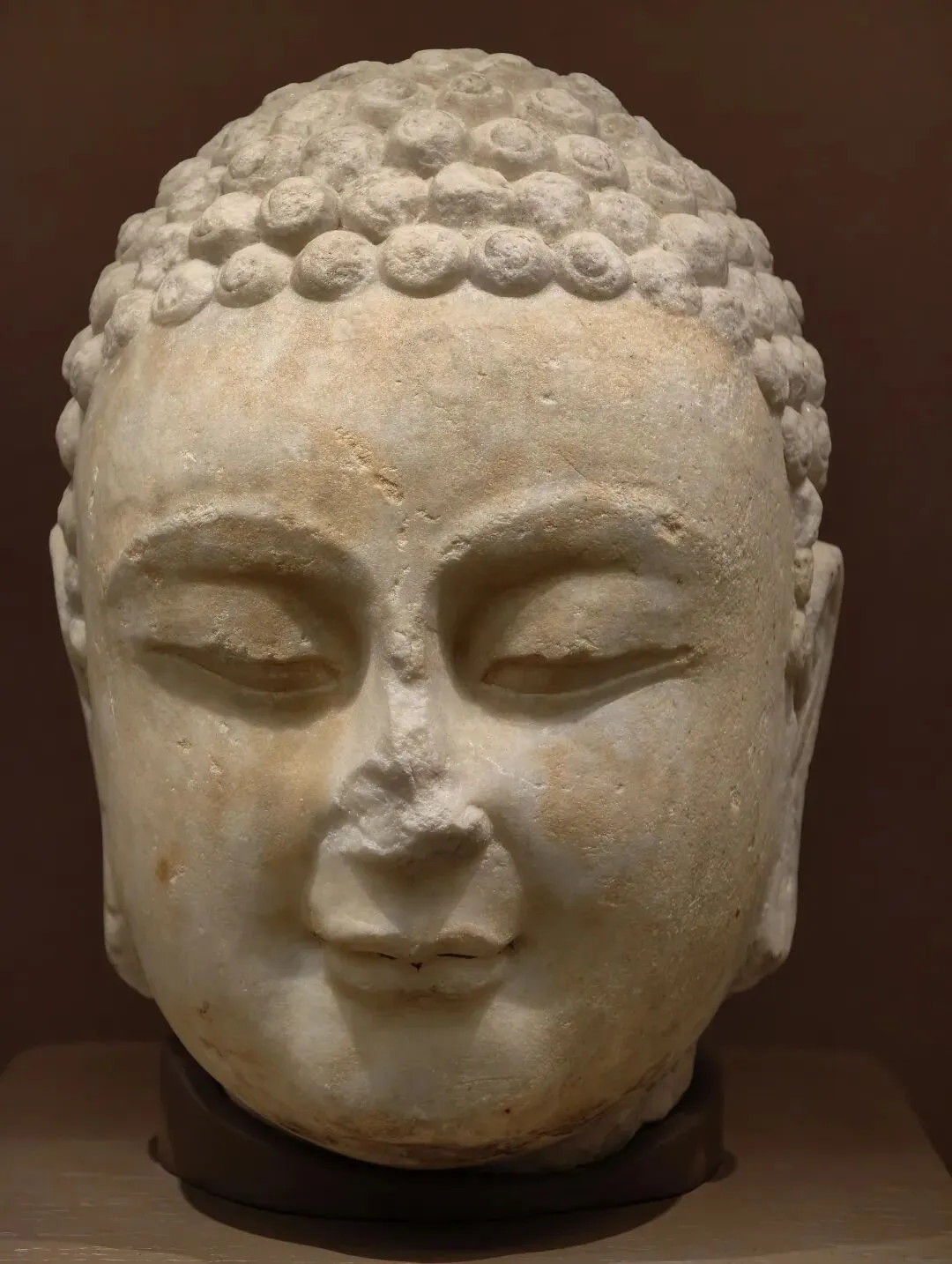 公元一世纪,在贵霜王朝的北部中心犍陀罗出现了受希腊化影响的佛教雕塑,在其南部中心马图拉出现了受印度本土艺术影响的佛教雕塑。这尊马图拉的菩萨头像,戴宝冠、饰耳珰,接近当时王公贵族的形象。