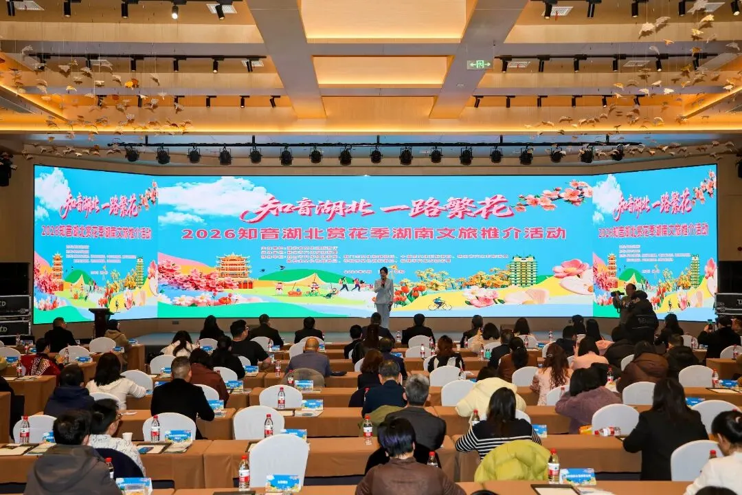 设置两大核心场地、两大主题活动,通过“线下推介+沉浸式路演+线上传播”的多元形式,全方位、多角度向岳阳市民及文旅业界展示湖北春季文旅资源与赏花魅力。上午,“美美与共・湘鄂同行”湖北文旅推介会暨旅行商洽谈会在岳阳阿波罗御庭酒店举行,活动现场播放湖北各地文旅宣传片,荆楚文化特色开场舞拉开序幕,瞬间点燃现场氛围。推介环节中,荆州率先登场,从荆州古城的浪漫春光、楚王车马阵的楚风遗韵、洪湖的水乡花海、松滋的山野灵秀、石首的麋鹿踏春、江豚逐浪,到荆州方特的潮玩欢乐,全方位解锁荆州全域文旅资源与春季精品赏花线路,其间穿插《洪湖水浪打浪》《这一仗打的真漂亮》等特色文艺表演,更有互动送礼环节,让现场嘉宾沉浸式感受荆州的多元文旅魅力。