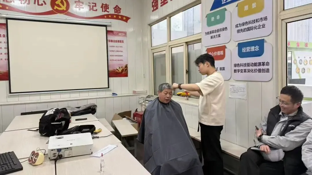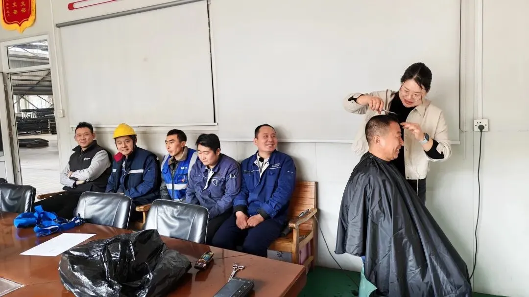 活动现场暖意融融、氛围热烈,理发师如约到岗,自带全套理发工具,快速搭建起临时“理发工作室”。无论是利落精神的板寸、清爽有型的碎盖,还是精致有型的美式渐变,只要员工开口,理发师都耐心打磨、细致修剪,力求让每一位员工都能剪出心仪发型。