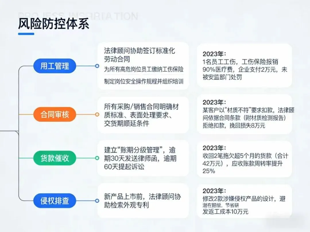 同区域160人规模五金厂,年营收约2200万元,每年投入3.5万元聘请法律顾问,搭建风险防控体系: