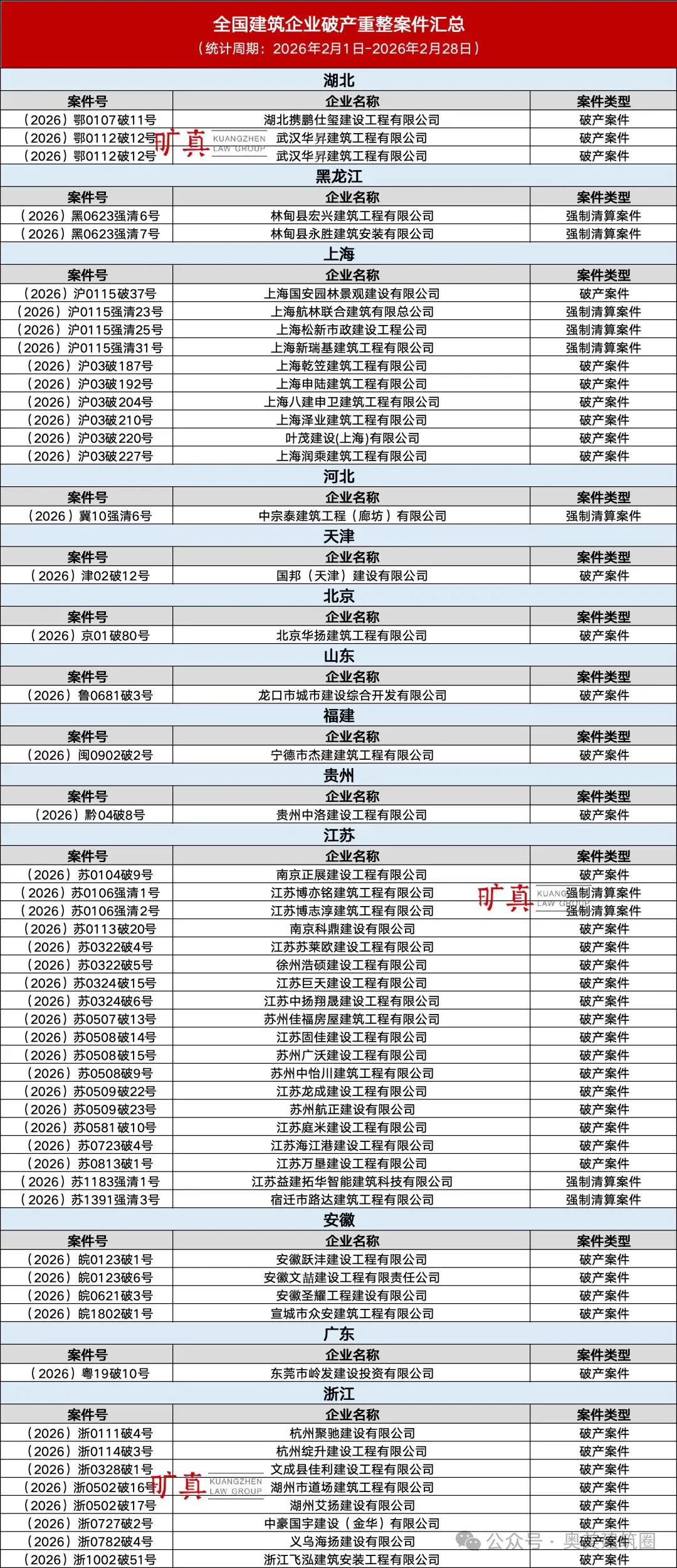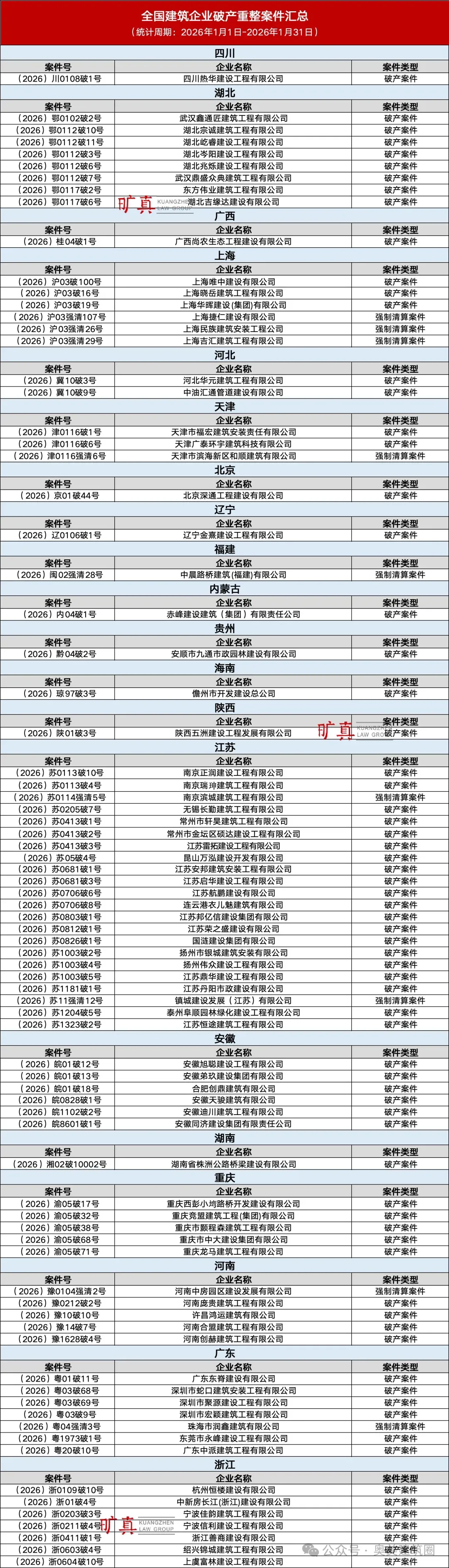 2026年1月全国建筑企业破产重整案件汇总(81家)