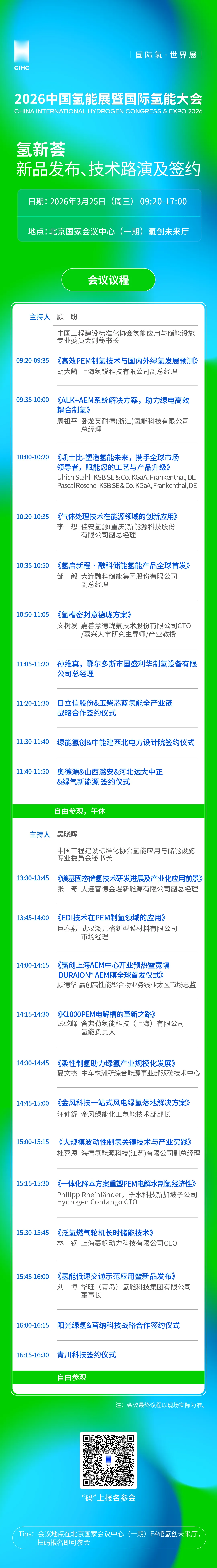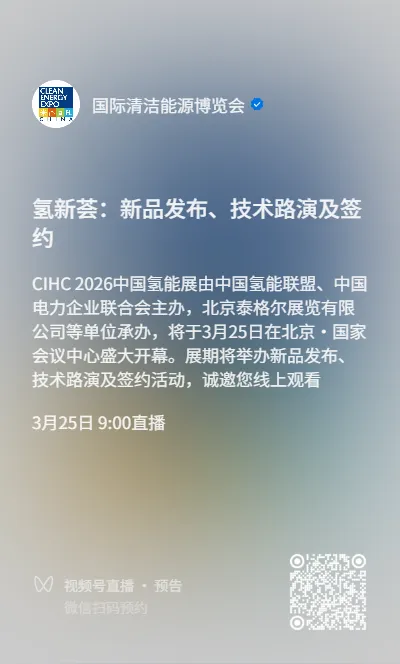 作为四大专业展之一,CIHC 2026中国氢能展将同期亮相。展期重磅活动“氢新荟”将于3月25日在国家会议中心(一期)氢创未来厅举行,届时将带来多场新品发布、技术路演及签约活动,诚邀您亲临见证!