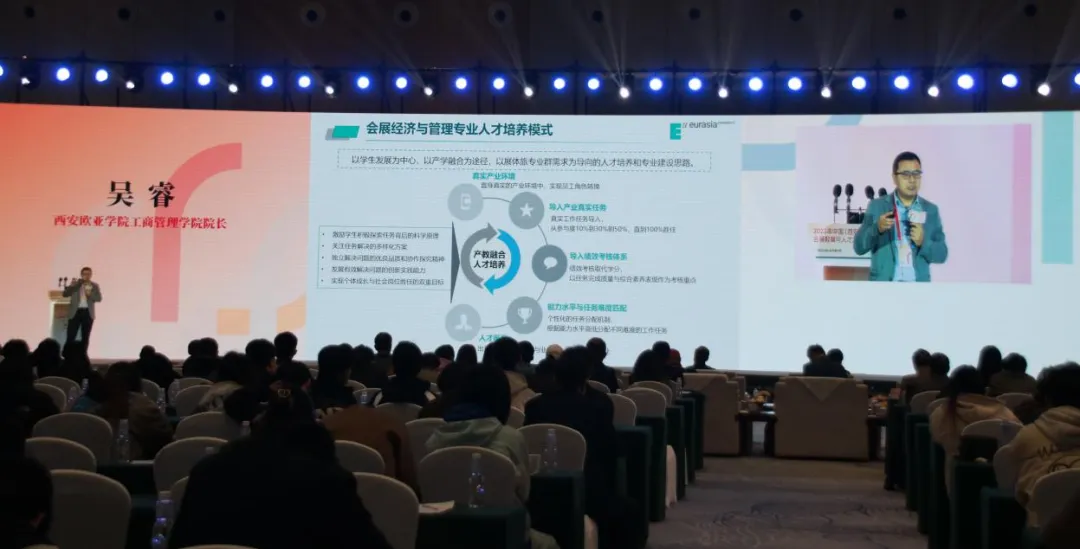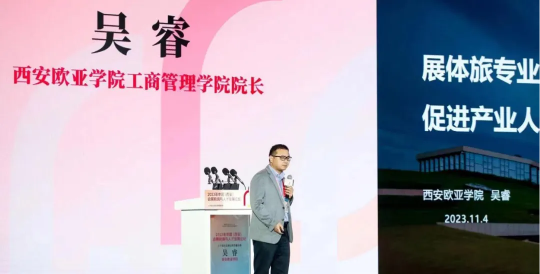 11月4日上午9时,经过主持人的精彩开场和嘉宾的致辞,西安欧亚学院工商管理学院院长吴睿在2023 年中国(西安)会展教育与人才发展论坛中进行了《展体旅专业融合促进产业人才培养》的主题演讲。吴睿院长从西安欧亚学院及工商管理学院的基本情况出发,根据人才培养目标,详细阐述了西安欧亚学院工商管理学院积极推进展体旅专业群建设,提出了立足欧亚学生、面向时代需求、促进资源整合共享的人才培养模式及校企合作模式,阐明了高校需要将会展教育与人才发展有效结合,形成与企业协同合作的完整教学体系,为学生提供更多学习机会,以高质量人才供给推动区域经济高质量发展。随后,吴睿院长参与了会展企业与会展高校共建会展产教融合联盟签约仪式。