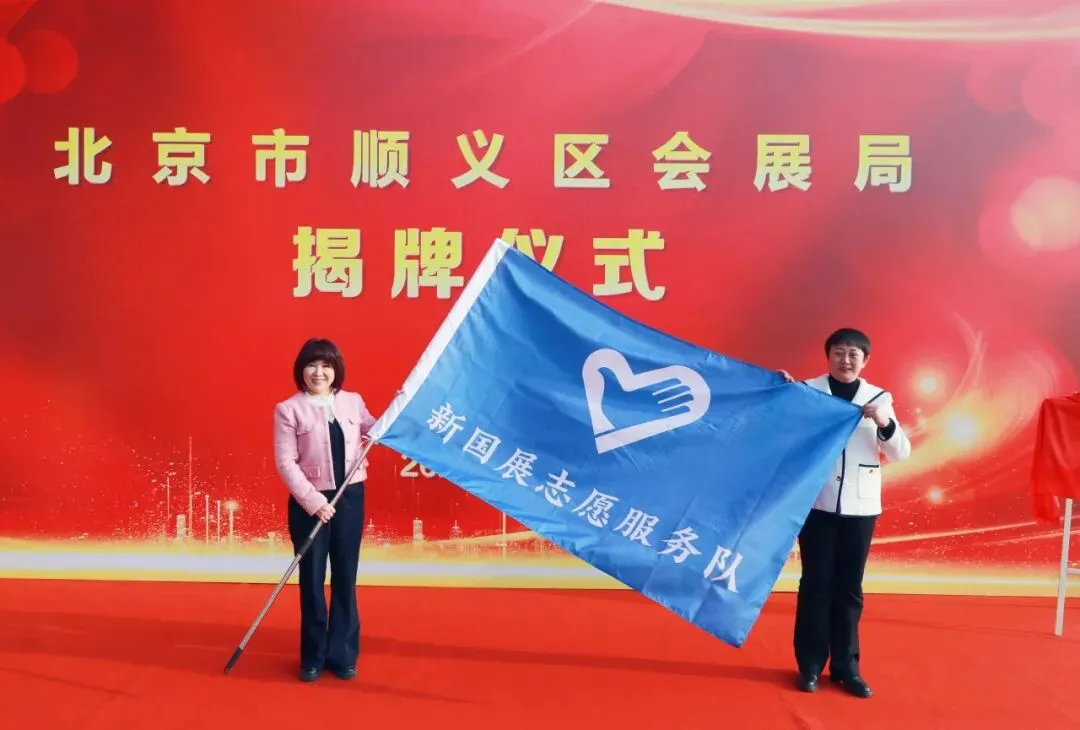 揭牌仪式现场,区委社会工作部负责同志为新国展志愿服务队授旗,激励志愿者继续以专业、高效、暖心的服务保障展会运行,展现顺义的城市文明形象。