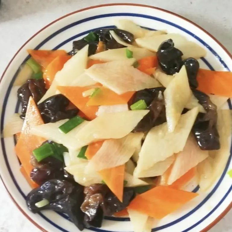 木耳炒山药:山药30g、胡萝卜5g、木耳2g