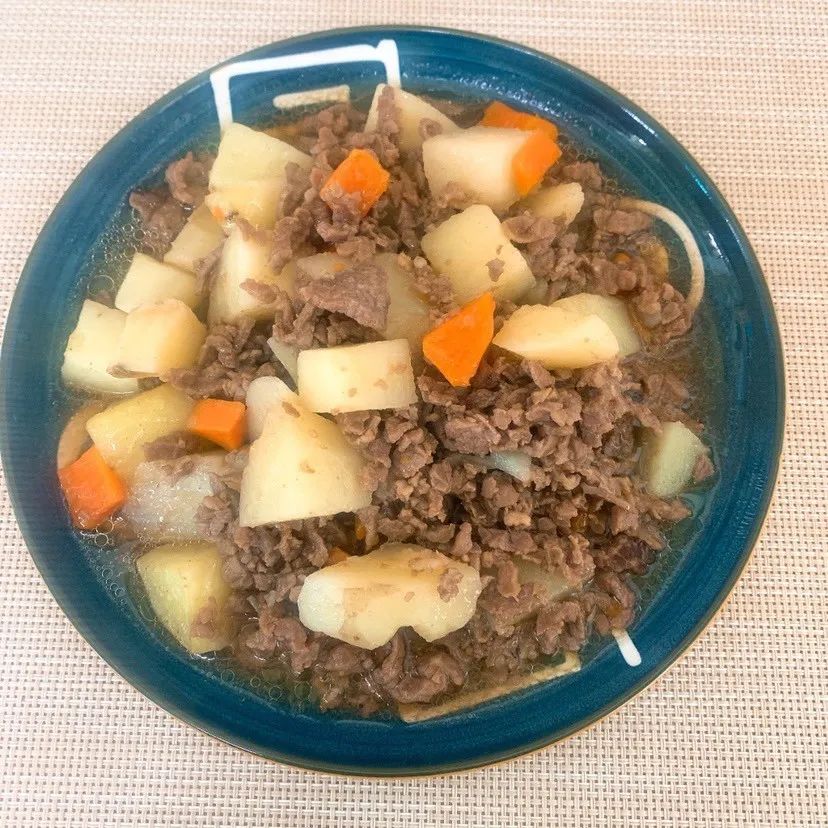 土豆炖牛肉:马铃薯30g、牛肉32g、胡萝卜5g