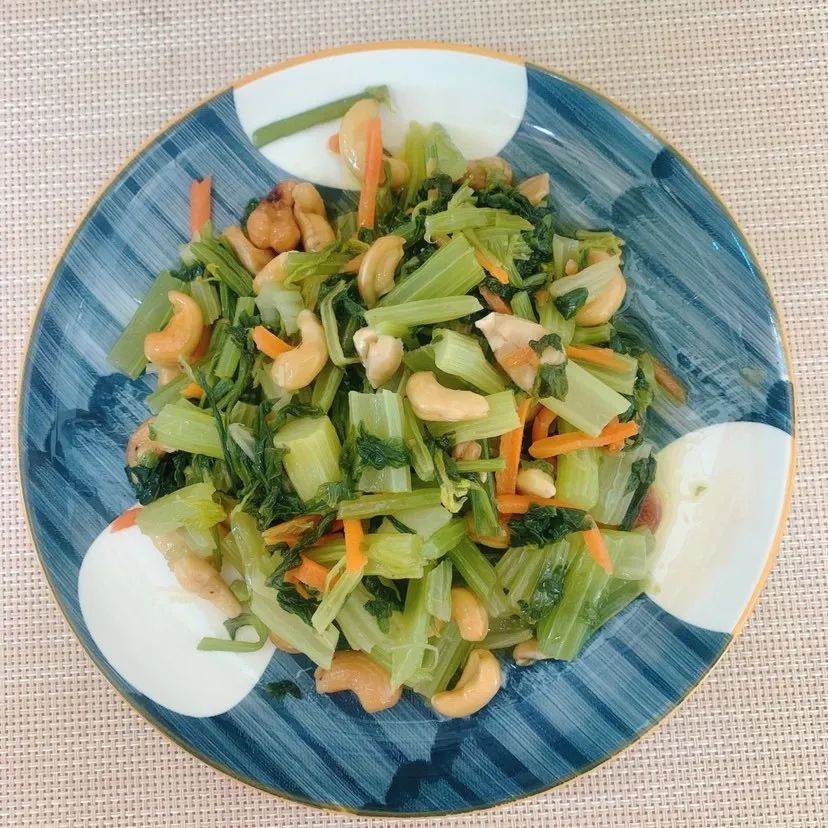 腰果炒芹菜:腰果10g、芹菜40g、胡萝卜5g