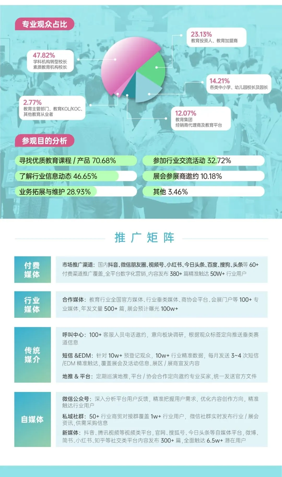 抢占与36000+专业观众,涵盖教育投资人、加盟商、机构校长、中小学/幼儿园园长、教育集团及经销商等,精准对接决策层的先机!