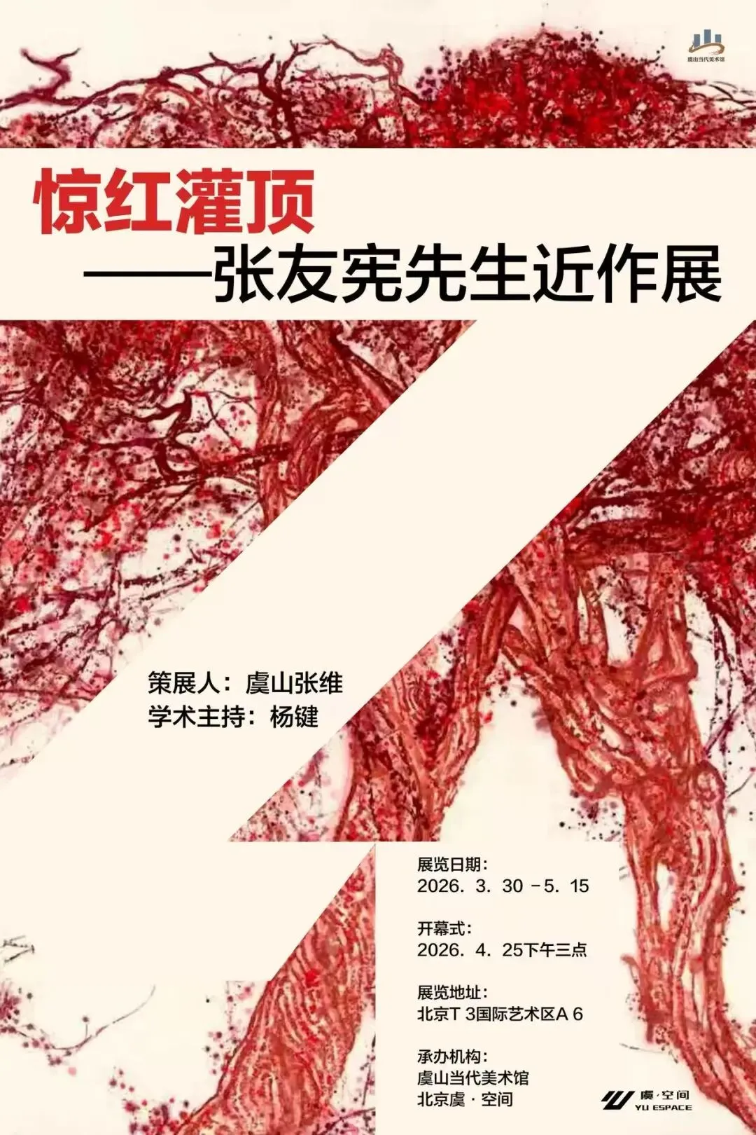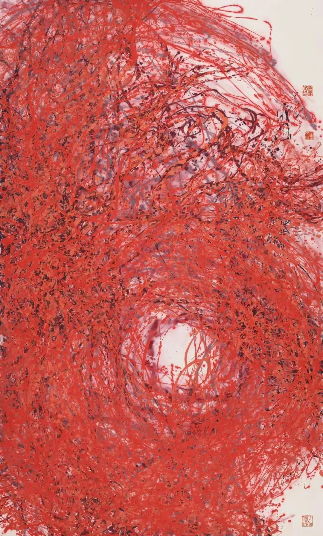 这个摄人魂魄的银朱,给我们带来了从未有过的感官冲击与感官愉悦,这是真正的中国红,这个红贯通天地也贯通人鬼,贯通人鬼也贯通天神,这个红在张友宪的画中炸开了,像石榴一样炸开,像桃花一样绽放,在其中,喜与悲在较量,善与恶在较量,那个红像鸟一样起飞,像鸟一样惊飞,由惊飞成为惊红,由惊红成为灌顶红,有一个转折,有一个新的时刻,就在这灌顶红里开始,之前四平八稳的平衡全被这红砸碎了,它要建立新的平衡,董欣宾在一场乡村之雨里画画,张友宪在一场现代性的雾霭里画画,因此必然有这革新之红与灌顶之红,这是革新红,这是灵魂红,这是写经红,。