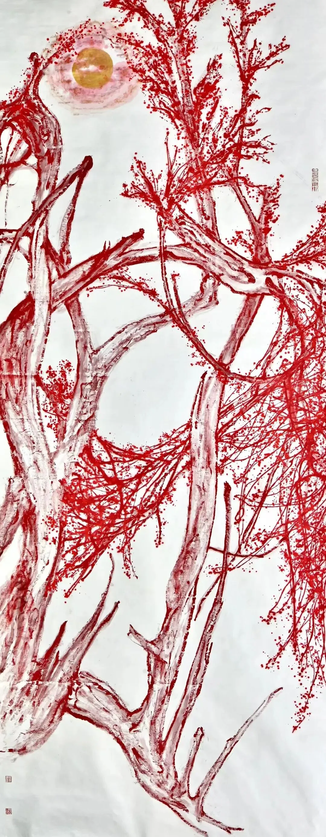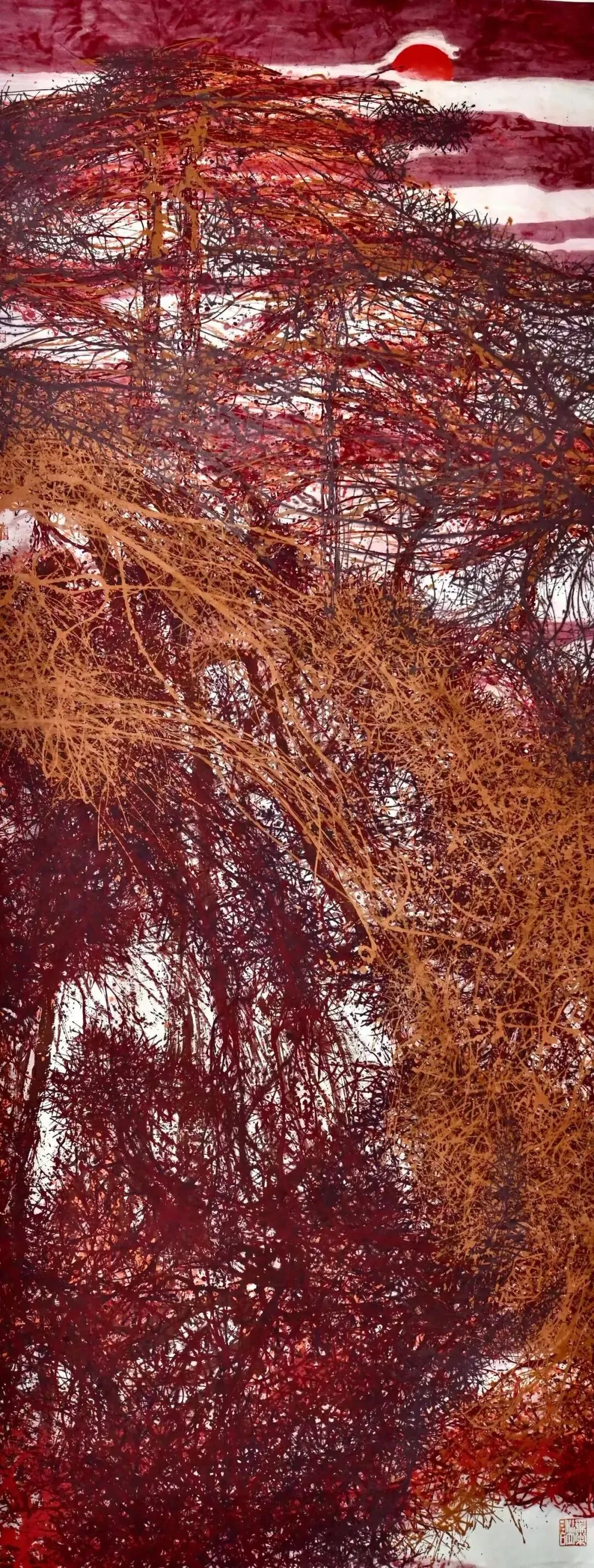 张友宪不喝酒但他的画却有强烈的酒神精神,持重,老成,厚实,万豪齐立,他的红松与红柏红得如此过瘾耀眼,他的最辣之红就像一滴老墨,一下子将画面点燃,如此新,如此老,如此沉稳,如此跳荡,已经自成河流,因此成为惊红,来给我们灌顶,灌顶红来了,这个红不是世俗红,不是家庭红,不是阶级红,而是灌顶红。