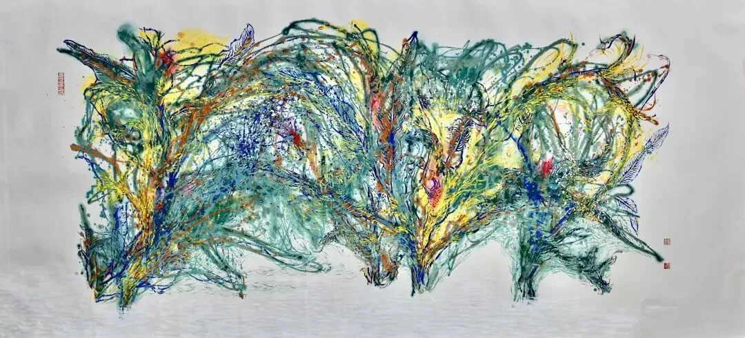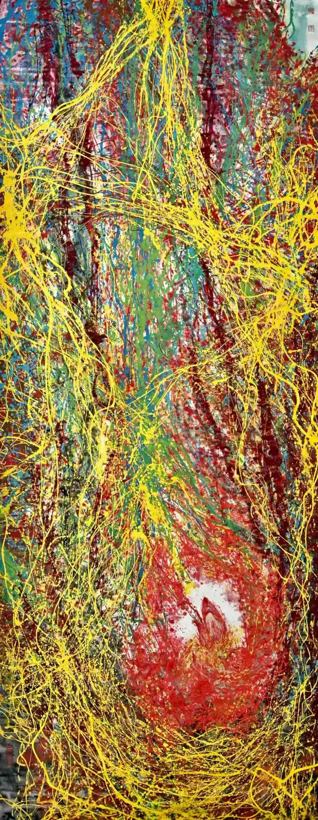 在他的画室里大画打开了,一张比一张大,一张比一张惊艳,一张比一张正大雄浑,像梦中的浪涛一样冲进眼睛,那么多被埋没的的激情泼洒在纸上,那么多陌生熟悉的情感熔铸其间,一张一张翻过,一张异于另一张,将我们淹没在从未见过的色彩的狂欢,这些画大都没有形象,形象在这里已经不重要,这里只有解体的欢喜,失去形象的欢喜,充盈在每一张画里,全新的写意,全新的刻画,可以把偶然运用到造化的份上。