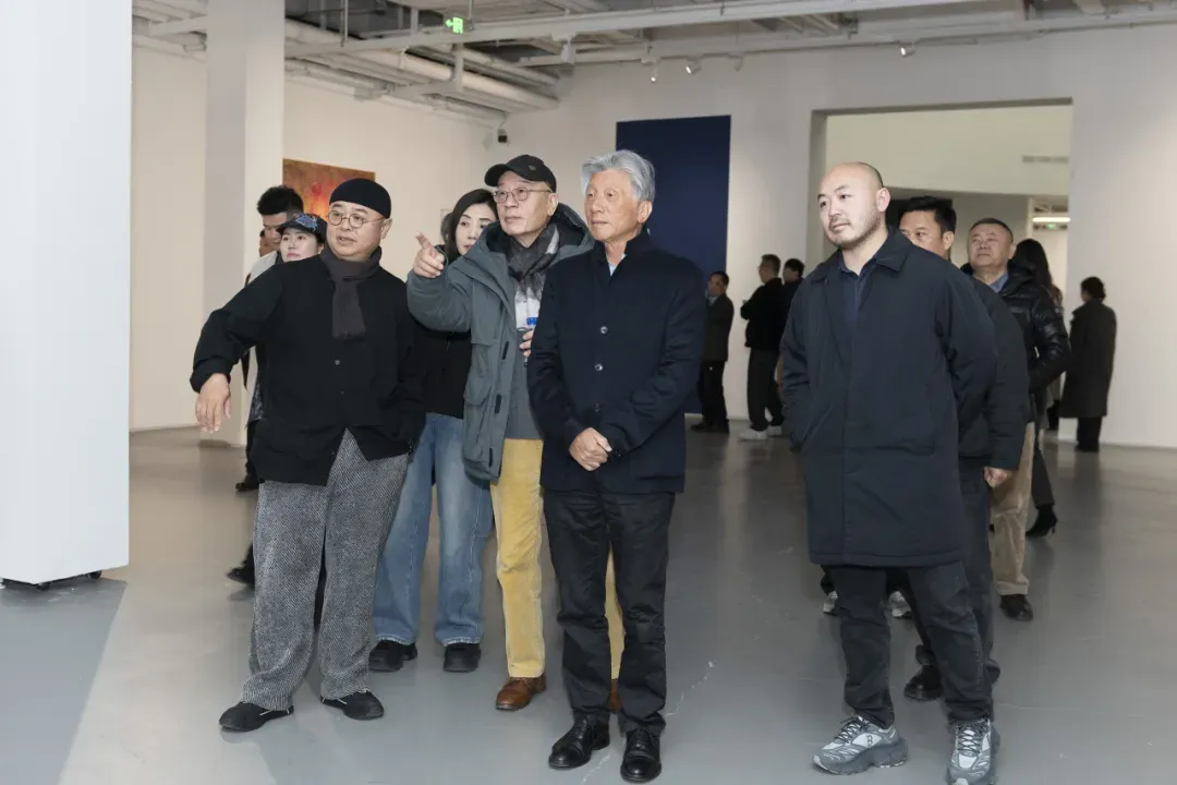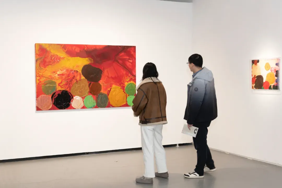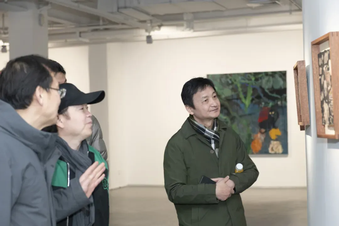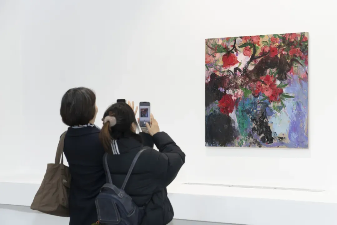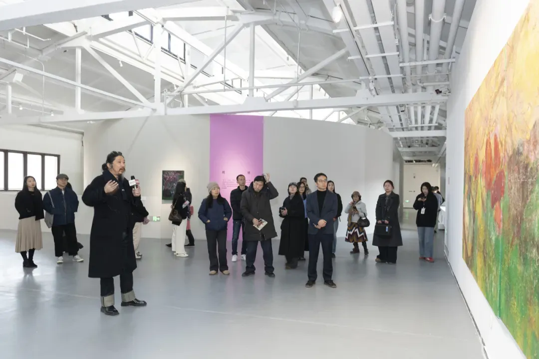 从“渡船坡”系列中桃花与山石交织的色彩关系,到“秘境”单元中若隐若现的灵兽意象,再到“弘虎”“石魁”“桃姚”等系列作品中不同的精神气质,展览呈现出艺术家近年来较为完整的创作脉络。开幕式结束后,黄礼攸与鲍栋陪同嘉宾参观了展览,并介绍了作品的创作背景与艺术思考。
