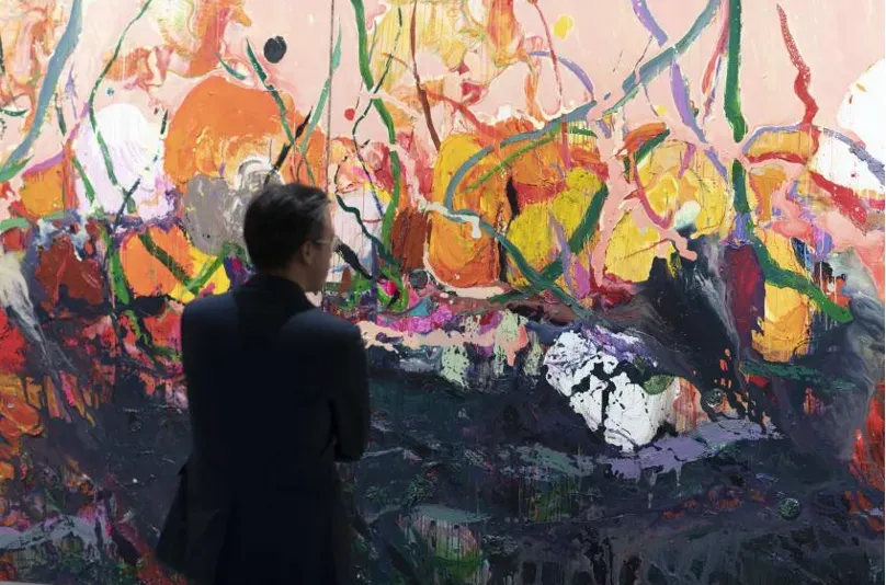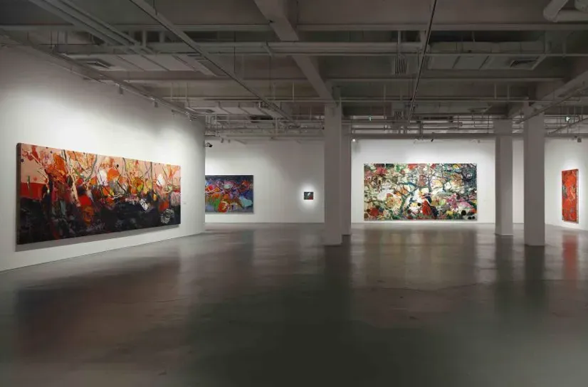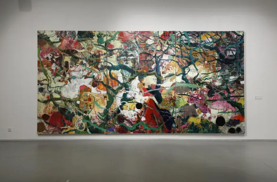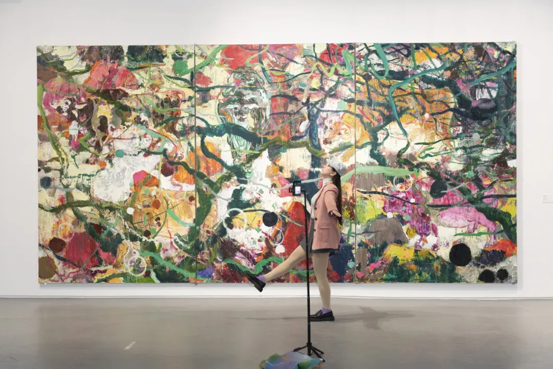 在本次展览中,黄礼攸以楚地巫觋传统与《山海经》的神话想象为文化线索,将桃花、山石与灵兽等意象组织为具有张力的视觉叙事。他在继承中国写意精神的同时,结合油画与丙烯材料的表现特性,使颜料在画面中自然流动与叠加,形成丰富的肌理效果。作品中的朱砂、黑金与绛红等色彩,也与马王堆帛画的色彩传统形成呼应。在艺术家的笔下,灵兽不再只是神话图腾,而成为与自然共生的生命形象,寄托着艺术家对土地、神话与自然世界的理解,使古老文化在当代绘画语言中获得新的表达。