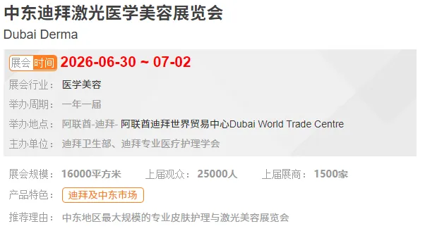 中东迪拜激光医学美容展(Dubai Derma)是中东地区规模最大、影响力最广的专业皮肤护理与激光美容国际盛会,每年在阿联酋迪拜举行,汇聚全球皮肤病学、医美技术与激光设备领域的专家、品牌与行业决策者。