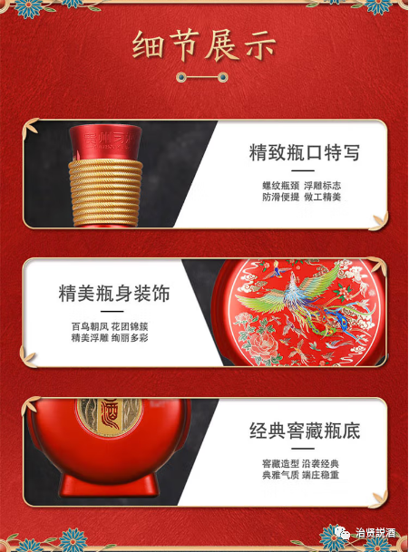 这款酒瓶身的正面乃红装饰瓶,吉祥喜庆;金色招牌,华贵辉煌。背面喜鹊报喜,凤凰呈祥;花开富贵,幸福佳酿。另外此酒精致的瓶口上还有浮雕装饰,做工非常的精美。经典的窖藏瓶底沿袭经典,典雅气质,端庄稳重。收藏引领酱酒“国潮”新风范,做喜酒品质酱酒携手美好祝愿,宴席助推消费新时尚。