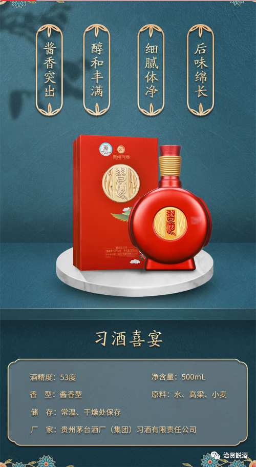 贵州习酒喜宴,是一款在酿制的时候,只采用水、高粱、小麦为原料,使用独特的酿酒工艺酿制而成的美酒佳酿。此酒酒体清澈,酱香突出,醇和丰满,细腻体净,后味绵长,无论是直接饮用还是搭配美食都很合适,是一款很值得大家入手的美酒佳酿哦!