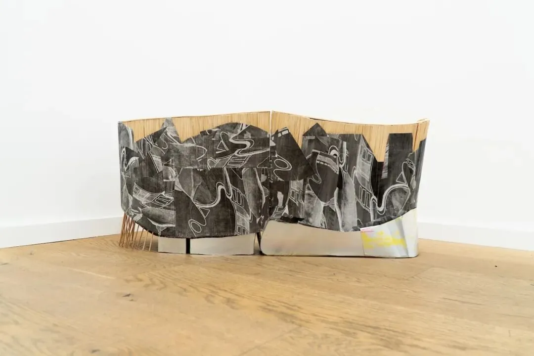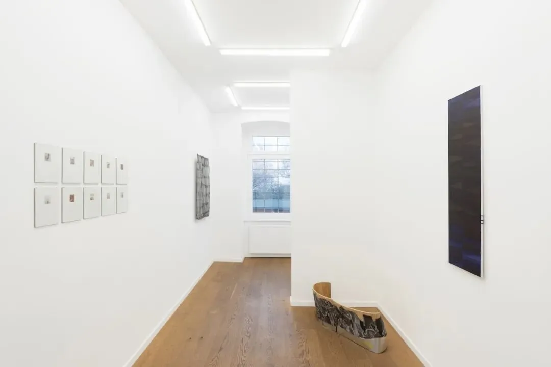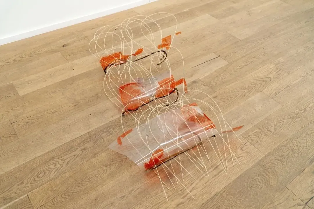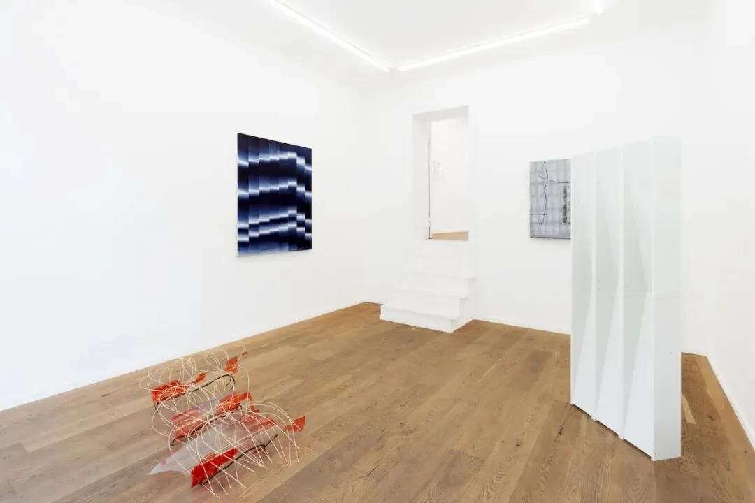 图拉·普鲁米则对日常居家物件的元素进行了重构。在作品《红》(Reds)中,线状元素穿透了带有红色手绘痕迹的透明表面,并被锚定于金属支架之上。艺术家借此将无机材料激活,使其转化为暗示着有机生长的网络结构。《夜景》(Night scape)呈现出一种双面景观地形。模糊了内部与外部的边界;背面则保留了材料的重复性逻辑,构筑出平坦的表面,以此唤回先前材料的功能性状态与自然倾向的平面。作品质询空间潜力显现于何处:在重复结构的原初功能中,还是在其重新配置所生成的间隙中。