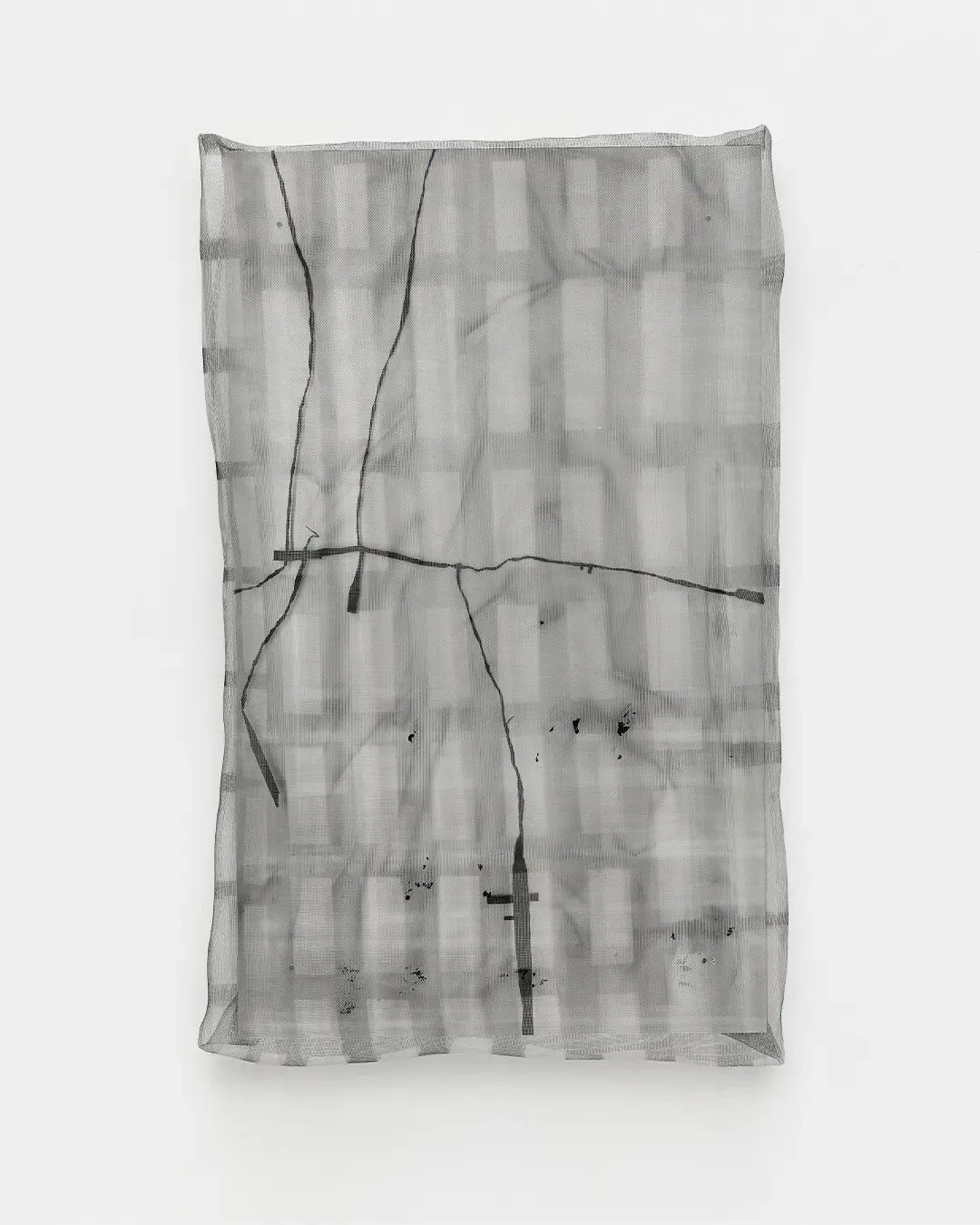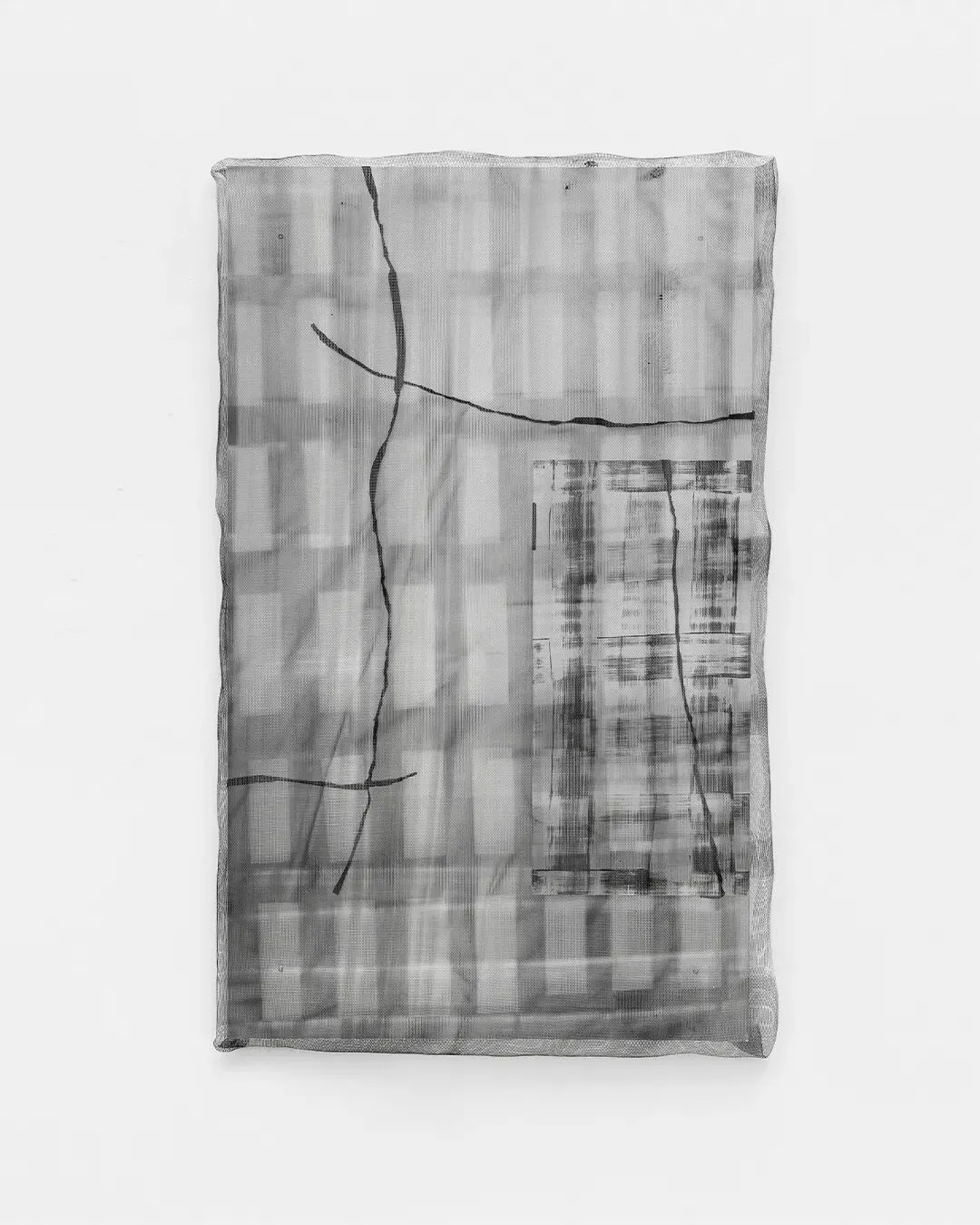 在久洛·沙吉(Gyula Sági)的作品中,网格的底层图式在一种严密的程序性逻辑中充当着核心变量:他将痕迹的构筑视为一种基于时间的操作,其序列化的墨水叠加产生出细微却系统性的偏差。在规则治理的结构中,这些“受控的误差”充当了“绵延(durée)”的索引式记录。相比之下,哈丽特·格罗斯(Harriet Groß)则主动扭曲了这些约束。她那些带有缓冲垫的铝制物件呈现出网格结构,暗示稳定性;然而覆盖其上的喷漆金属网却将固定性转化为流动(flux)。随着观者视角的移动,这种层叠使网格悬置于持续的振荡之中,进而生成了一种可做多重诠释的流动结构——将网格维持在一种积极的流动状态中,恰与米歇尔·塞尔(Michel Serres)的哲学相契合。