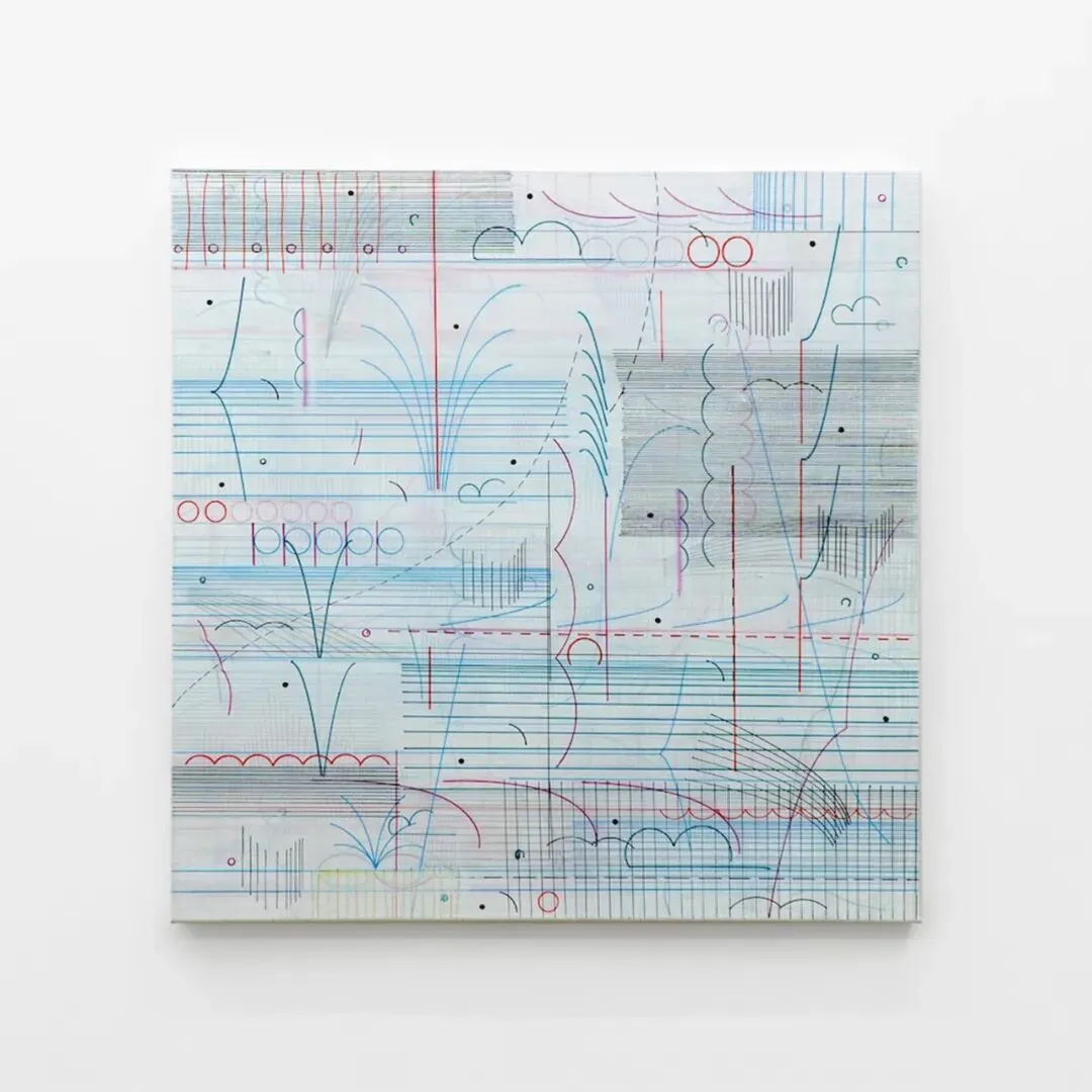 DAG运用三角形、正方形、圆形与线条等几何元素来构筑画面,其创作深受马列维奇与康定斯基的启发。 在本次呈现的作品中,密集的彩色线条网络相互交汇并彼此干扰。有机形态在几何结构内部浮现。网格在图像上被不断削减,或仅作为一种暗示出现,从决定性的组织法则转变为一种视觉残余。