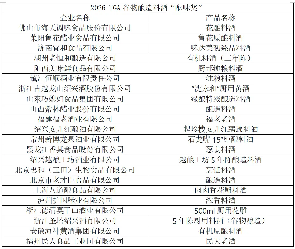 附:2026 TGA谷物酿造料酒“酝味奖”名单