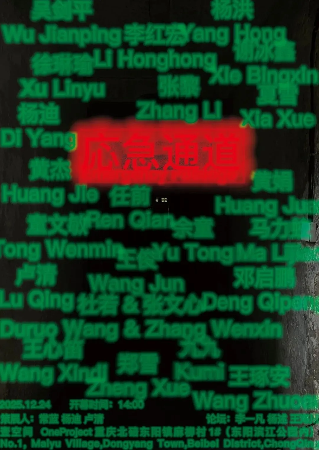 应急反应,是一种动物性的反应,在艺术创作中显得重要,我们没有西方的严谨历史叙事,和逻辑,自我认知和在现实中的本能反应也许是生存的必备技能,这种情形下会不会在多年的中国社会叙事中产生出属于自身的文化逻辑,这也许有某种可能性存在,这次展览取名“应急通道”是针对目前生活和工作在重庆的一群艺术家,在外部环境极度变幻的当下继续自己的思考和创作,除了作为这种状态的呈现同时,壹项目的空间给大家在北碚,这个大后方提供一个安全通道!