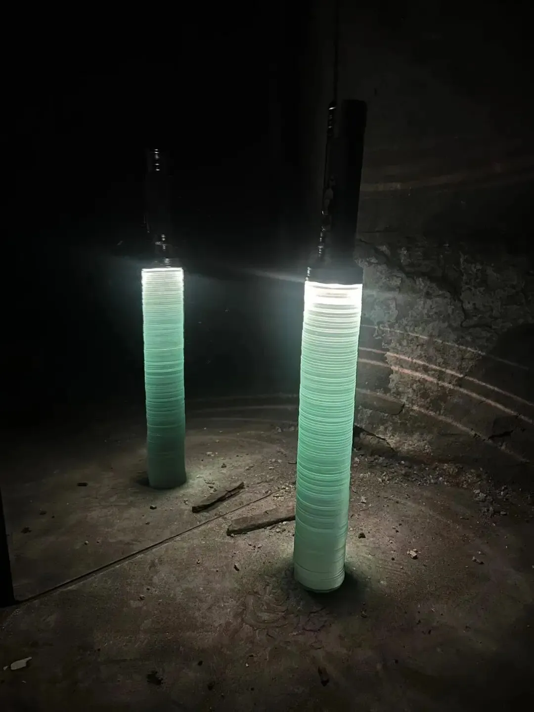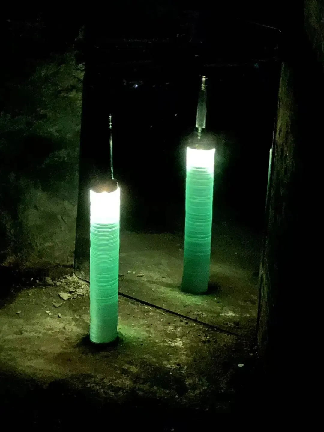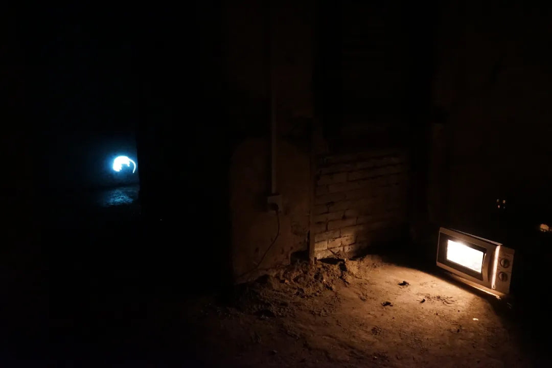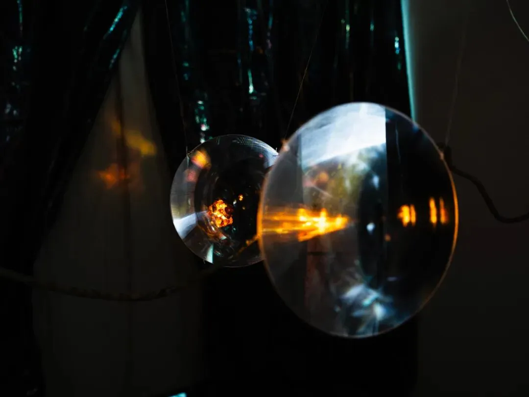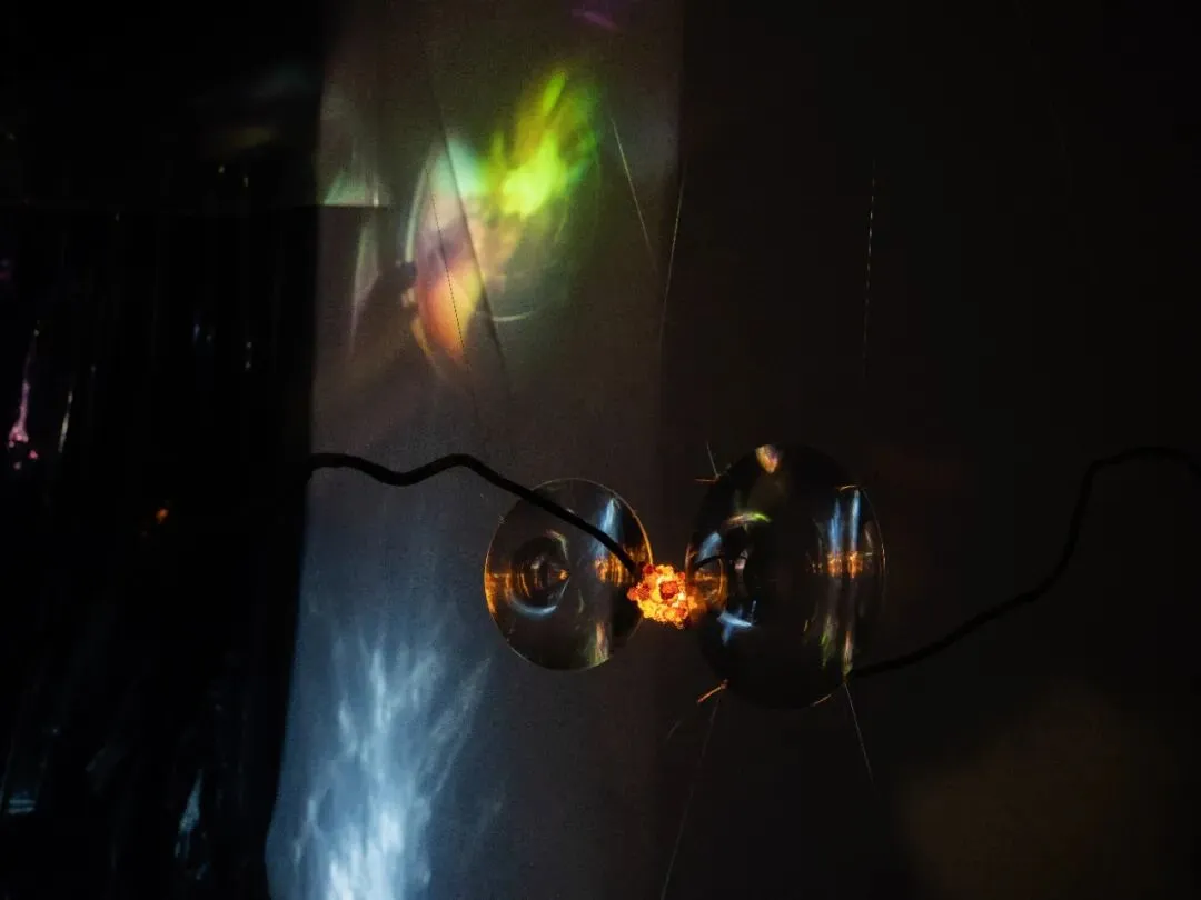 他以倒置的老式铁皮手电筒为光源,照亮玻璃片垒成的柱体,并借镜子制造“双柱”幻象,形成一道沉默重影,铁皮手电筒与筒子楼,是集体生活时代的共生“标本”。装置通过重构光、物与空间的关系,邀请观众思考个体记忆与集体历史之间真实与反射、湮没与显现的复杂对话。