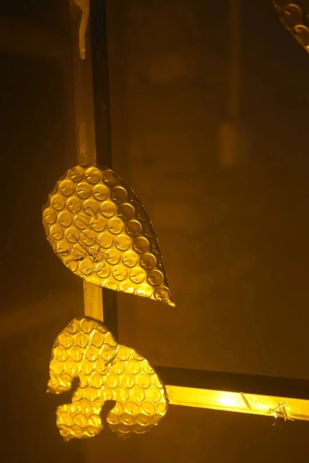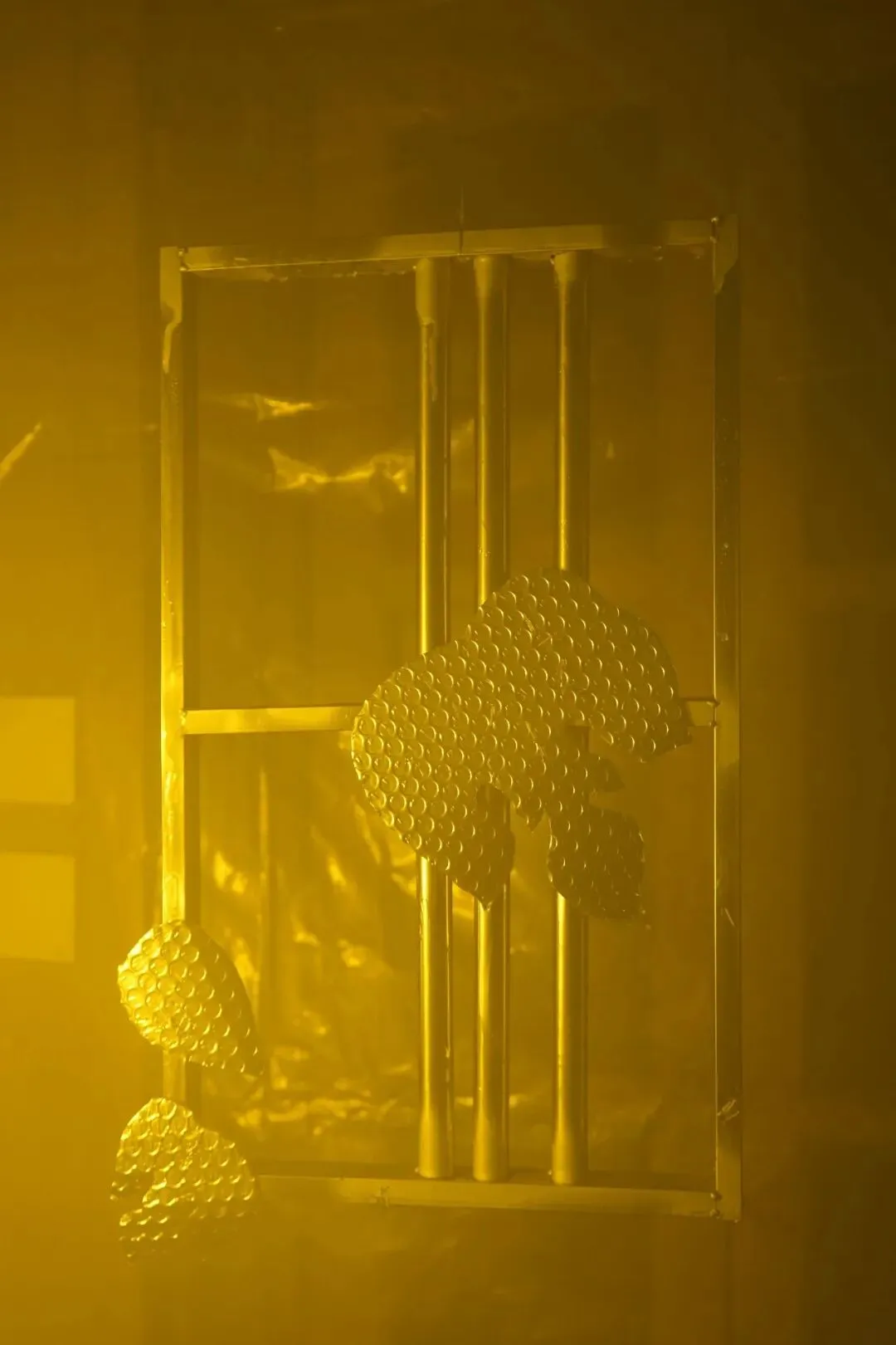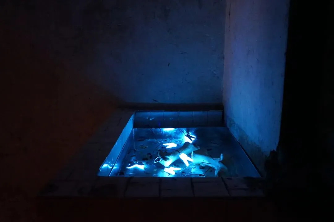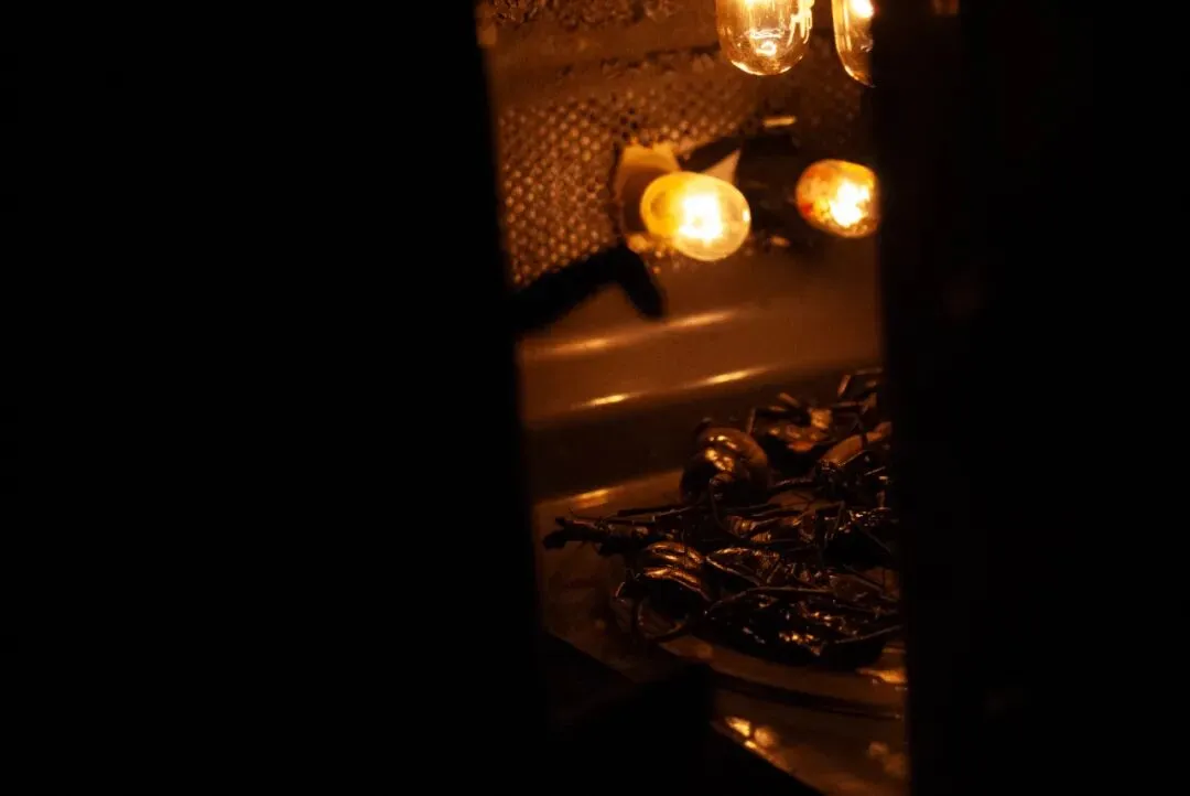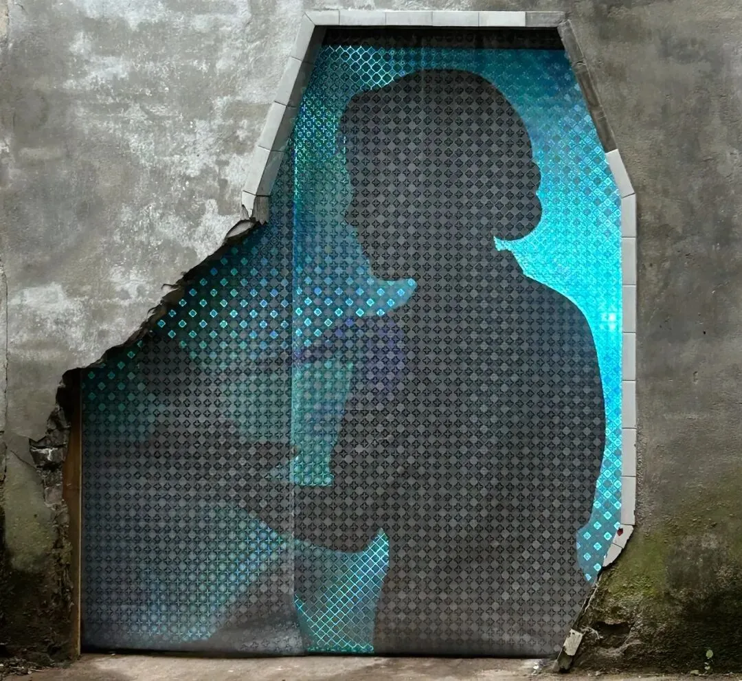 他以倒置的老式铁皮手电筒为光源,照亮玻璃片垒成的柱体,并借镜子制造“双柱”幻象,形成一道沉默重影,铁皮手电筒与筒子楼,是集体生活时代的共生“标本”。装置通过重构光、物与空间的关系,邀请观众思考个体记忆与集体历史之间真实与反射、湮没与显现的复杂对话。