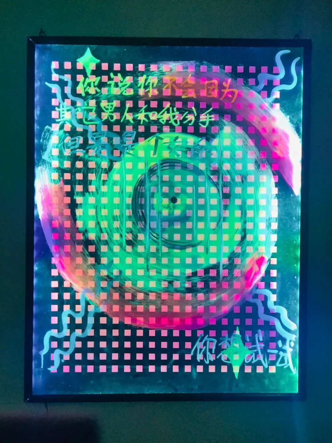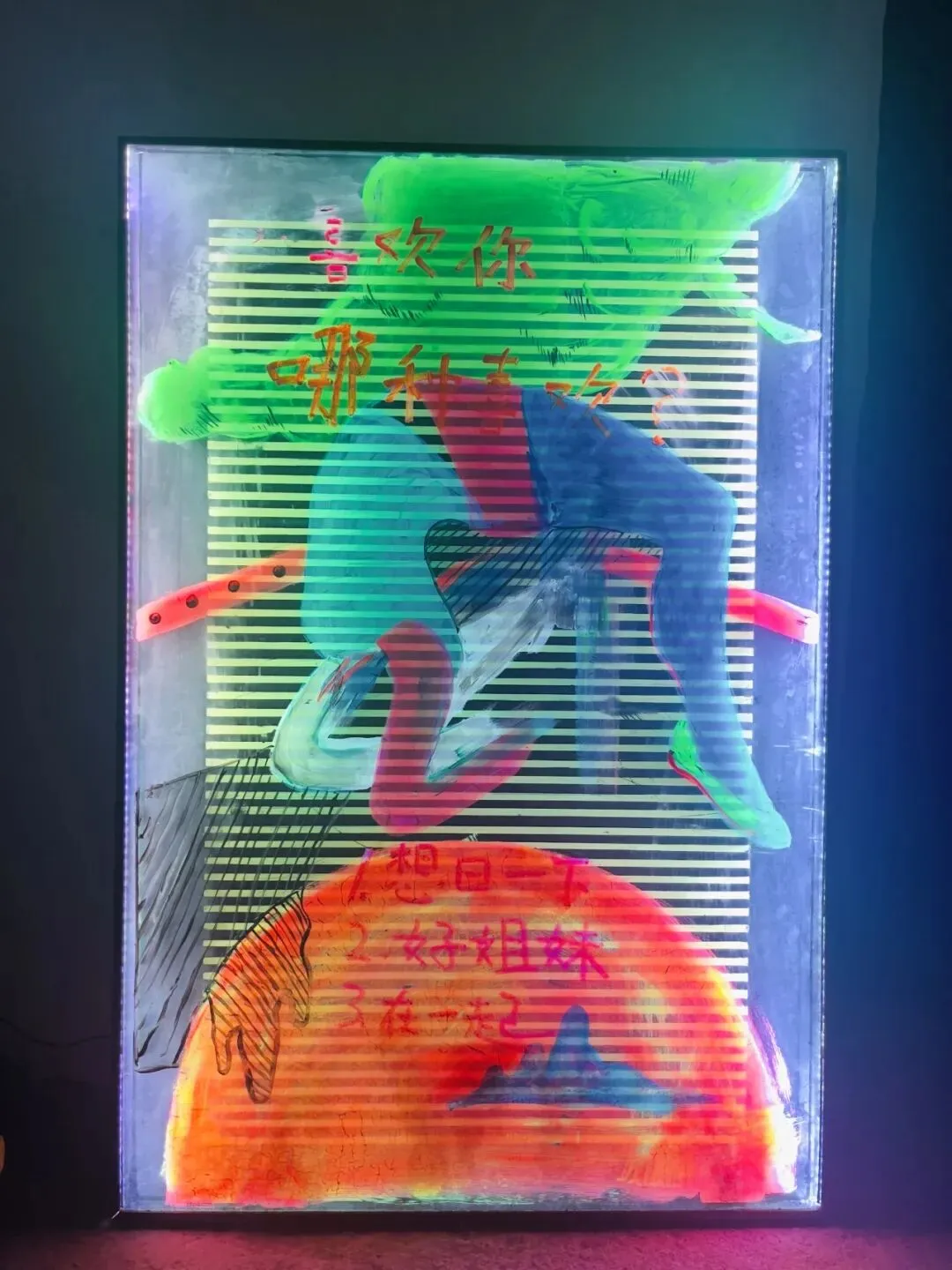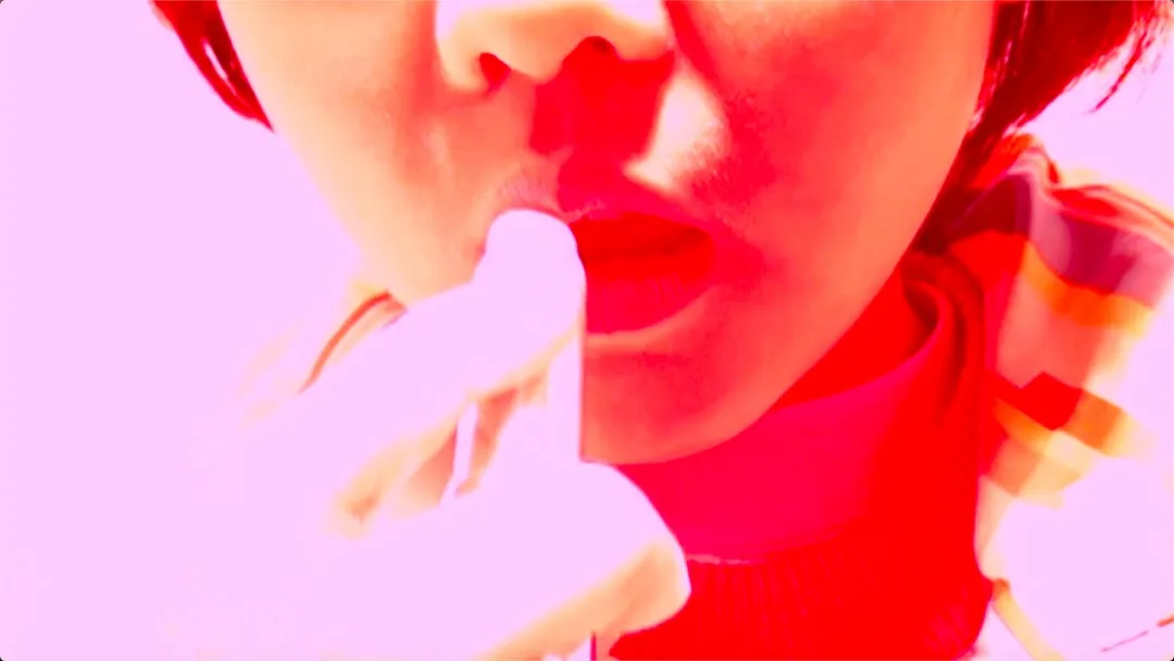 《不要在痛经时想起我》作为作者的个人项目《你不是你笔下的人物,但你笔下的人物是你》的重要组成部分,将私人“恋爱史”中的私密对白配合色彩的“电光”质感,呈现一种既高度可见又转瞬即逝的瞬间,暗示着难以持久的强烈情感,映照出浪漫激情转瞬即逝的本质。通过露骨的对白,触及了多元性别身份,在光影闪烁中重审亲密关系里的欲望与疏离。