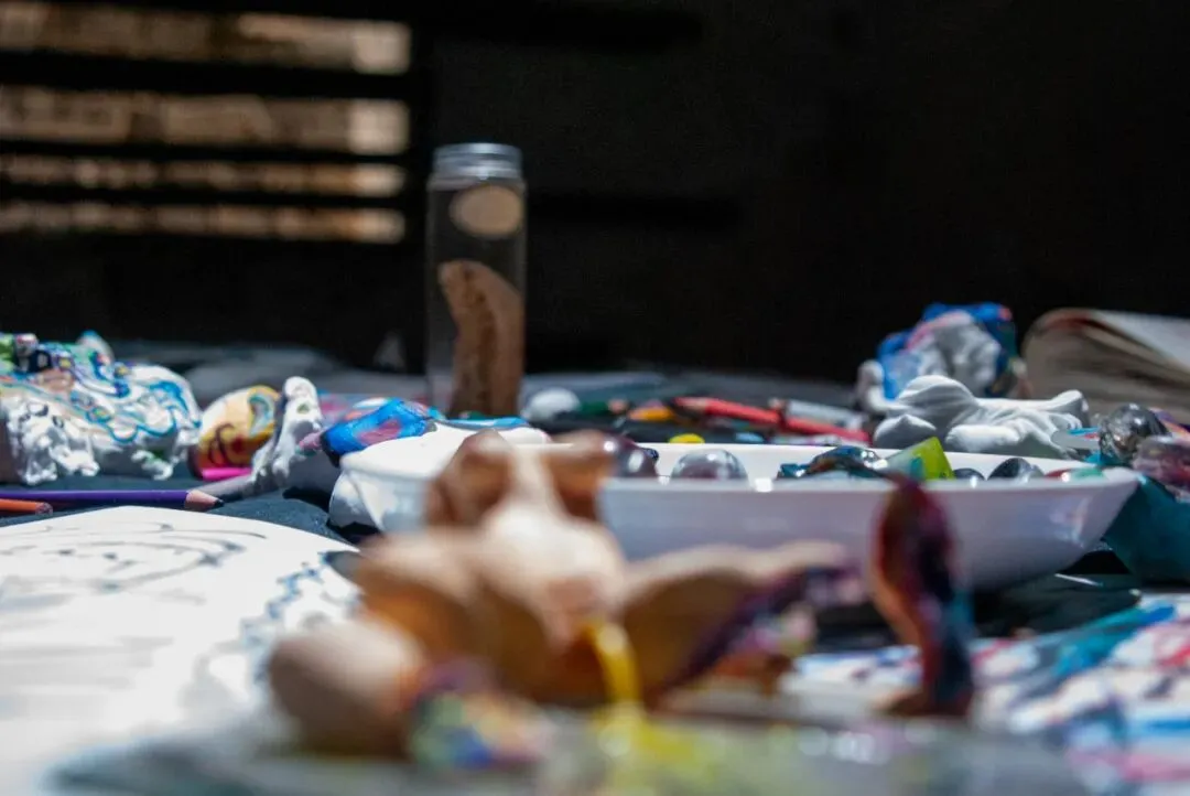 水彩纸,丙烯,彩铅,玩具,拼接记忆中的故事碎片,尝试搭建一个域界入口可以短暂跳出现实生活。