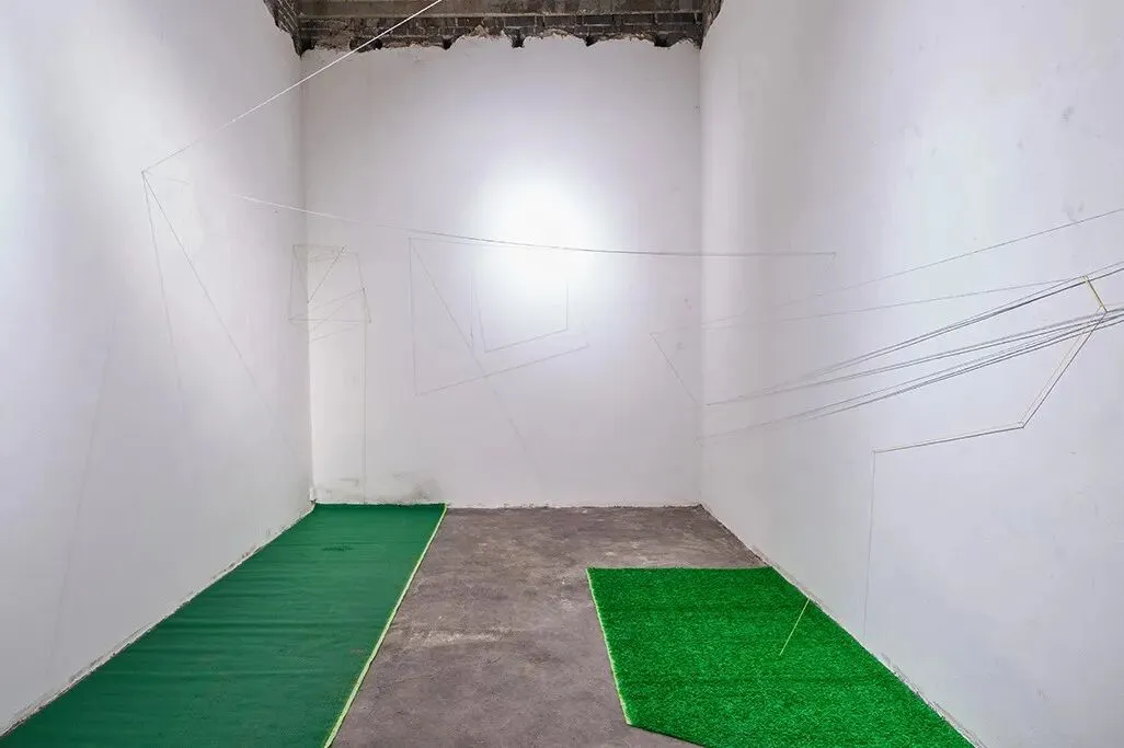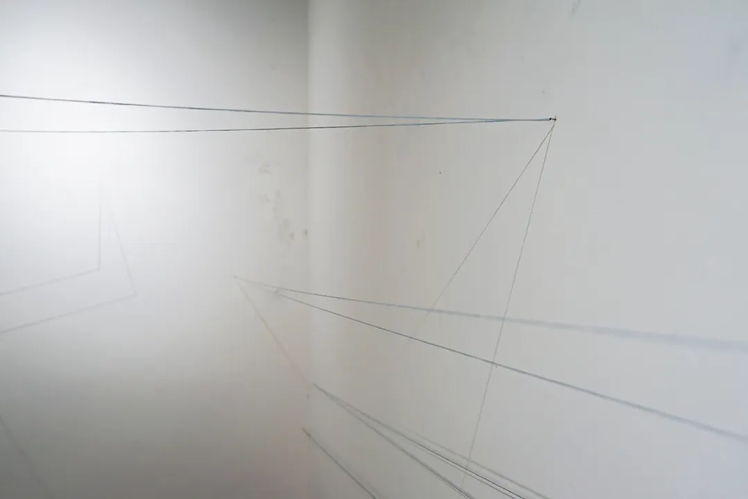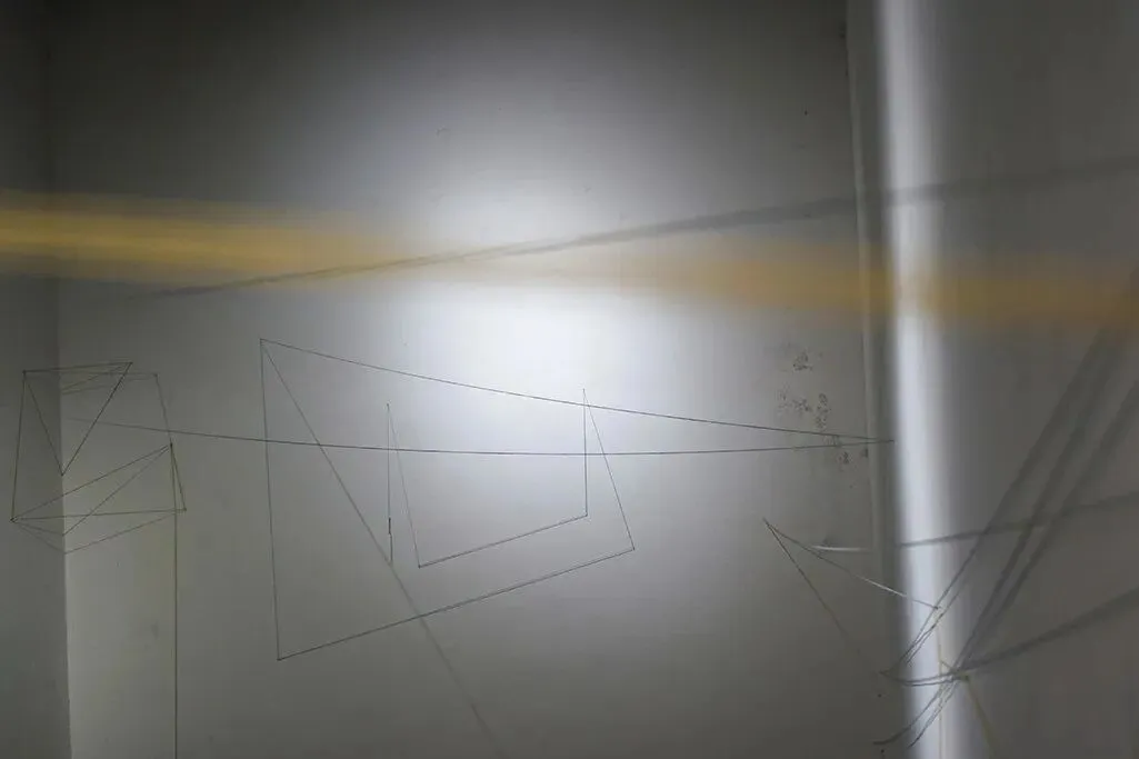 这个项目的原本计划是我想在这房间里好好地分析和思考关于家和幸福。当我一进入这空空的房间时,在一个角落里发现有一个小小的蜘蛛网。我以为蜘蛛网是蜘蛛的家,可是它并不是。蜘蛛是为了生存需要才织网来捕捉食物。织网需要小心翼翼,躲开光线和大型行动路线,尽量把存在隐藏起来。网的界限是警惕线,网里的安全是他者的不安全。但人是可以从光,线,和形成的视觉或缝隙里感受额外的东西。比如微妙的表层美感。人也许感受到从简单或错综复杂里带来的记忆和预感。