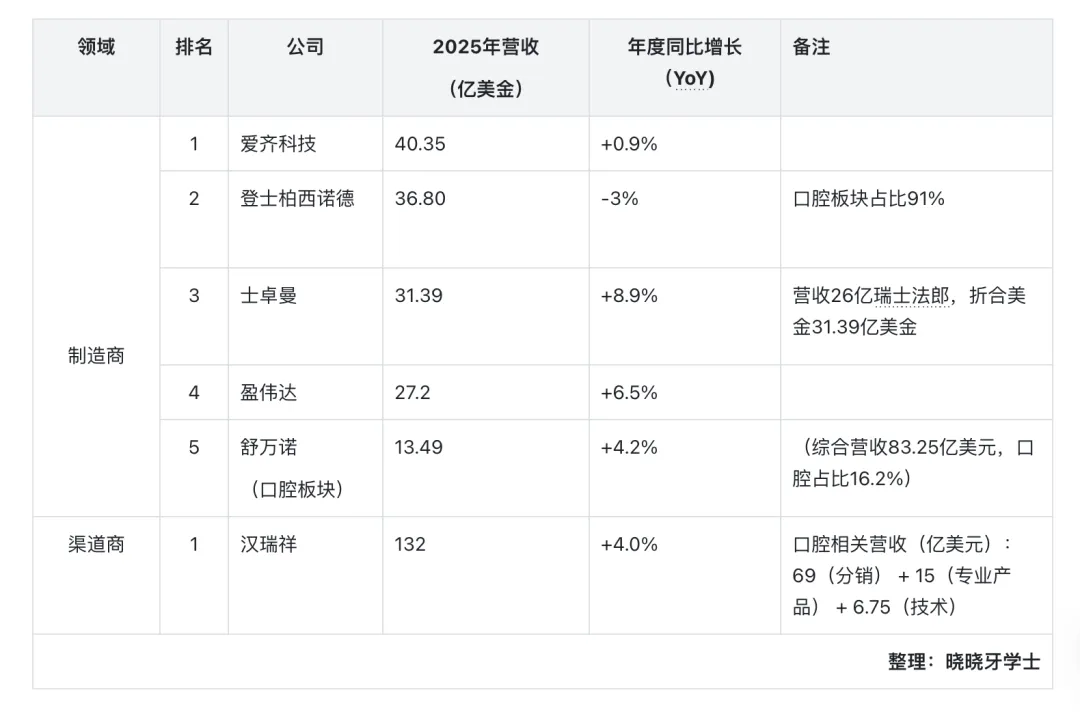 而汉瑞祥作为全球牙科分销领域的头部企业,2025年整体表现稳健,口腔相关业务主要由三大板块构成: