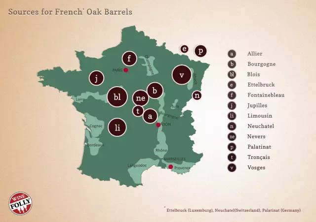 法国的一些橡木林的品质被公认为最佳,木材的价格也最昂贵,最知名的如Troncais、Allier、Nievre、Vosge、Limousin等, 各个林区所产橡木各具特点。东欧的橡木主要来自于匈牙利和斯拉沃尼亚地区,性价比很高。意大利很多大木桶是用斯拉沃尼亚橡木制造的,有人认为这些橡木对于赤霞珠、黑皮诺等法国品种来说单宁过强,更适合匹配桑娇维赛和内比奥罗。葡萄牙也出产少部分橡木,主要来自于北部,如果加工得当,可以作为法国橡木的廉价替代品。