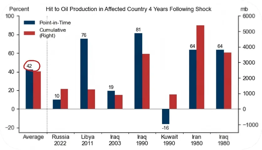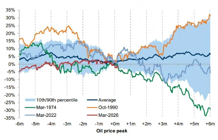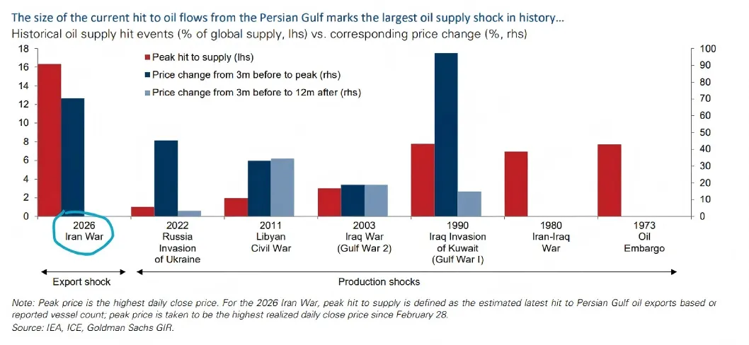 周末高盛交易台的观点我觉得说的很真,角度也很新颖。市场正站在一个关键转折点——定价逻辑从"通胀冲击"切换到"增长冲击"。油价当前的核心矛盾不是价格本身,而是相关性翻转;黄金不是避险资产,它是当下最拥挤的多头。高盛甚至让五个地区的首席经济学家同时上线,回答同一个问题:"2022年的教训如何改变了你们对央行反应函数的理解?"内容可能偏复杂,所以我们今天聚焦三个关注度最高的问题:今天这期内容,我觉得质量不错。高盛不同团队,用不同的数据、不同的逻辑框架,指向了同一个结论——而这个结论与市场主流共识之间,存在巨大的认知差,尤其是关于宏观的视角。市场在交易什么?油价涨→通胀→利率上→股票跌。这是条件反射,也是2022年的肌肉记忆。但高盛高级宏观顾问Dom Wilson在电话会上说了一段很有意思的话。他说,1990年海湾战争时,油价飙升的初期,收益率确实跟着往上走。但到了最后一波大涨时,收益率停止上行甚至开始下降——那个时刻,就是市场定性从"通胀冲击"切换到"增长冲击"的转折点。他问了一个所有人都应该问自己的问题:我们现在到那个点了吗?他的答案是:有迹象了。周四油价和央行冲击之后,短端收益率大幅上行,但长端收益率反而下降了。铜价本周也大幅下跌——此前铜一直挺住的。这些都是周期性担忧开始渗透的信号。再看数据。高盛商品团队的Daan Struyven在电话会上给出了一个数字:目前波斯湾石油流量的冲击规模,是2022年4月俄罗斯峰值的18倍。18倍。而且流量没有改善。数据来源:IEA, ICE, Goldman Sachs GIR。左轴为供应冲击占全球供应比例,右轴为对应价格变化幅度如果你还在用"通胀冲击"的框架交易,你的头寸方向可能完全反了。一旦市场共识切换到"增长冲击",利率会掉头向下,美元兑日元会大幅波动,之前扛住的周期性资产会补跌。(今天高盛的观点值得思考,这个和前几天的观点可能出现头寸的相反性)来源:Datastream, Goldman Sachs GIR。这一轮会像90年代海湾战争快速反弹,还是像70年代引发全球滞胀?高盛资产配置主管Christian Mueller-Glissmann的风险偏好指标主成分分析显示:政策冲击已经被定价了,但增长定价几乎没跌。这意味着市场在"增长会不会出问题"这件事上,没有给出足够的定价。市场已将利率冲击纳入定价,但增长定价仍保持积极—一这与2022年的能源冲击形成鲜明对比(当时股市估值较低)还有一个被忽略的细节:过去50年五次最大的石油供应冲击中,即使4年后,产量平均仍减少40%。不是4个月,是4年。基础设施损坏和投资不足带来的产能损失,远比市场想象的持久。高盛周末让五个地区的经济学家同时回答同一个问题——"2022年的教训如何改变了你们对央行反应函数的理解?"美国市场的Volex交易主管说了大实话:"我们原以为全球短端头寸更为清晰,但过去两天证明并非如此。市场目前对英格兰银行和欧洲央行的加息定价均超过3次。这说明市场在给2022年式加息周期赋予实实在在的风险溢价。"翻译一下:市场不是在交易央行"会不会加息",而是在恐惧央行"失控式加息"。来源:Goldman Sachs GIR。深蓝=PC1全球增长,橙色=PC2货币政策。注意2022年后央行政策波动显著加剧美联储:首次降息从6月推迟到9月。失业率预计9月达到4.6%,关税效应消退后核心商品通胀应该显著下降。但伊朗局势是基础通胀的上行风险——高盛的判断是,鲍威尔不会在这个时点冒任何风险。到2026年12月,市场给美联储的降息定价只剩4个基点。等于说,市场认为美联储今年基本不会动了。欧洲央行:基准预期是今年按兵不动。但如果油价严重扰动,可能从6月甚至4月起加息75bp。英国:本周最大的"黑天鹅"。英国央行的鹰派转向直接触发了大面积止损。SFIZ6在声明后移动了超过50个基点——高盛自己都承认他们原本预期英国央行会从降息转为按兵不动,没想到直接变成了通胀警报。利率策略师说得更直白:"过去几周非常艰难,几乎所有年初至今的共识利率交易都遭遇了止损,尤其是前端多头。"日本央行:7月加息仍是基本预期,4月加息的可能性也不能排除。高盛新兴市场策略全球主管做了一个统计:目前全球只有极少数国家(美国、巴西、以色列)还在定价降息。绝大多数市场已经转向定价加息。尤其是欧盟。所以这轮周期有一个反直觉的特征:即便经济数据开始走软,降息的门槛可能也要高得多。不是央行看不到衰退信号,而是他们选择性忽视——因为犯"鹰派过头"的错误,在政治上的代价远小于犯"鸽派太早"的错误。上一次全球央行集体"过度紧缩",是沃尔克时代。那一次的代价是深度衰退,但也杀死了通胀。这一次呢?在中东冲突全面升级的背景下,黄金从5400跌到差点破4500。很多人不理解,包括上周的市场共识也是先定义流动性。高盛EMEA和亚洲商品交易联合主管Tony Kim的复盘非常清晰。他说:"风险偏好下降、减仓操作、债券收益率上升以及美元走强,共同导致了黄金市场的显著清算。"但更重要的是他后面那句话:"中东冲突持续时间越长,贵金属的清算就越多。"这完全违反了"地缘冲突=买黄金"的直觉。但逻辑链条是这样的:2022年以来,央行大规模增持黄金作为储备资产,改变了整个游戏。Tony Kim指出了一个关键的盲点——央行买黄金的目的,从来不是简单地囤积尽可能多的黄金。目的是在危机时能用这些储备去换关键物资:石油、食品、武器,以及捍