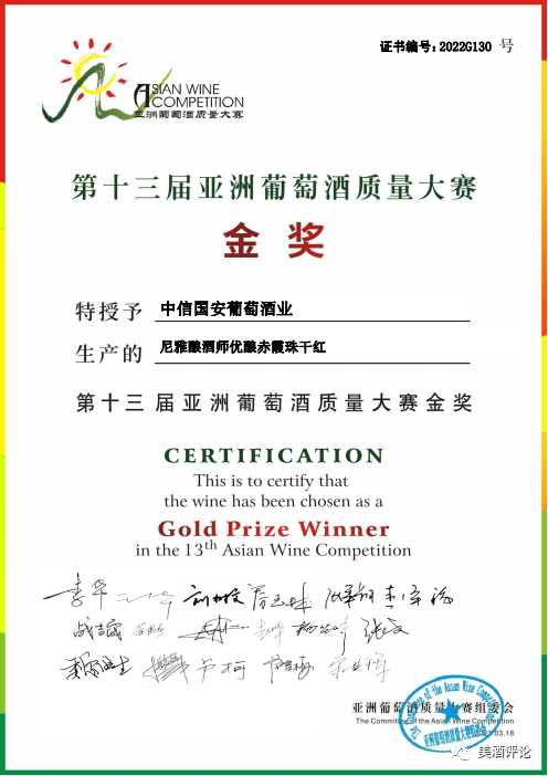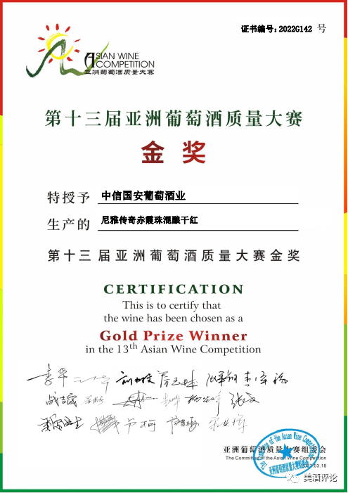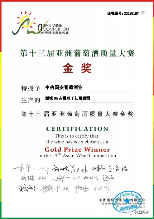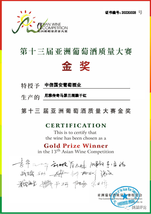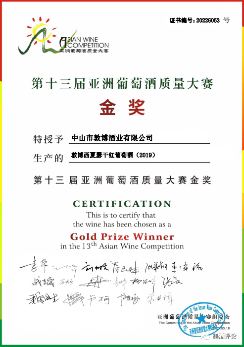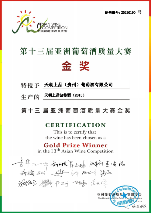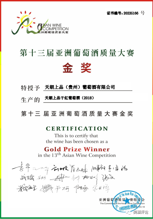 天朝上品波特酒(2015)、天朝上品干红葡萄酒(2018)两款产品斩获第十三届亚洲葡萄酒质量大赛金奖。