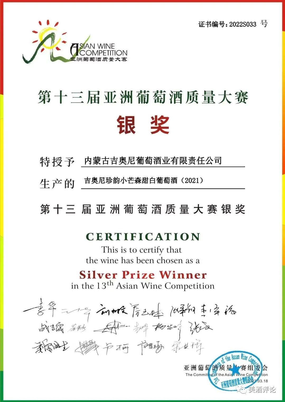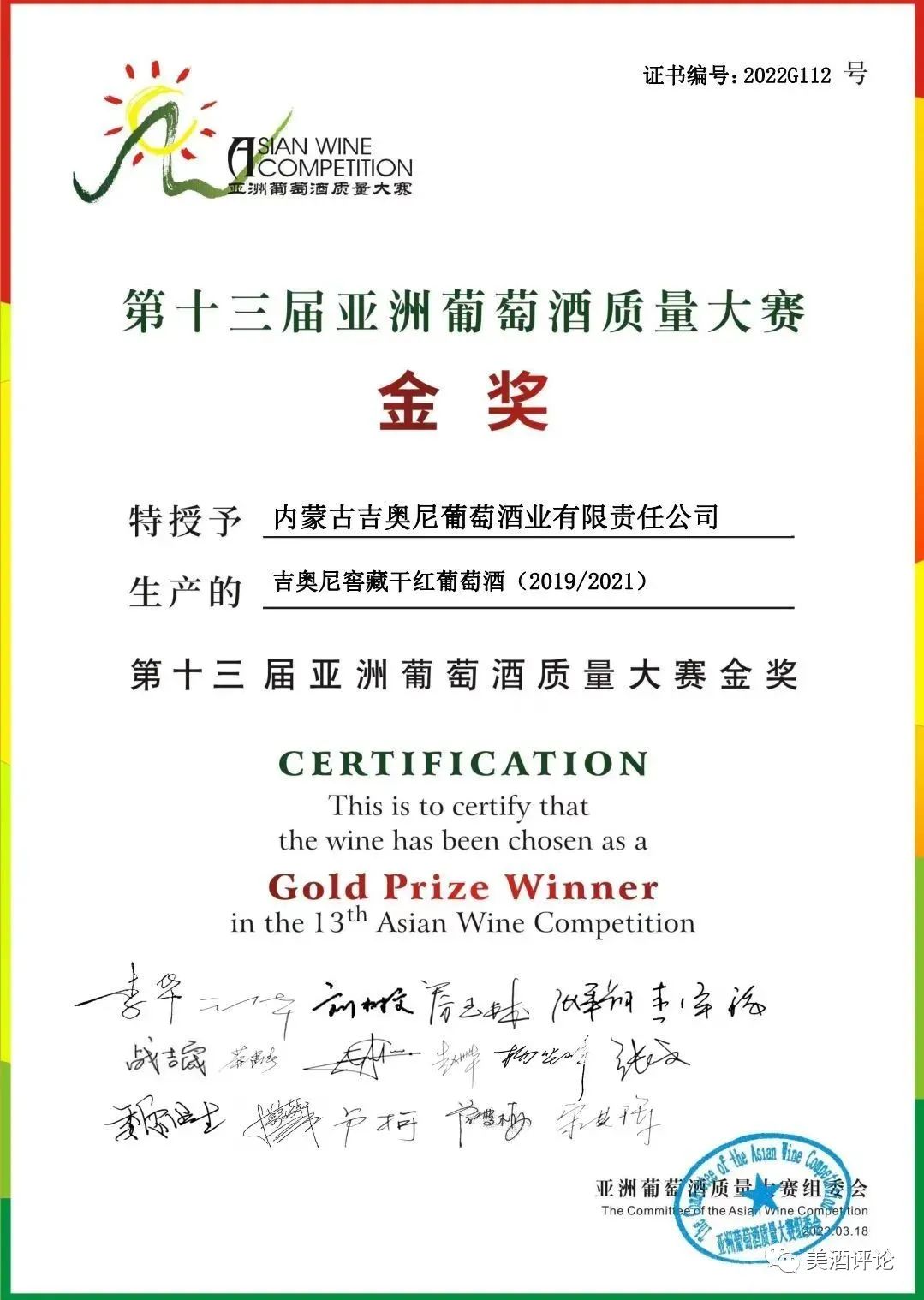 吉奥尼窖藏干红葡萄酒荣获第十三届亚洲葡萄酒质量大赛金奖、吉奥尼珍韵小芒森葡萄酒荣获大赛银奖。