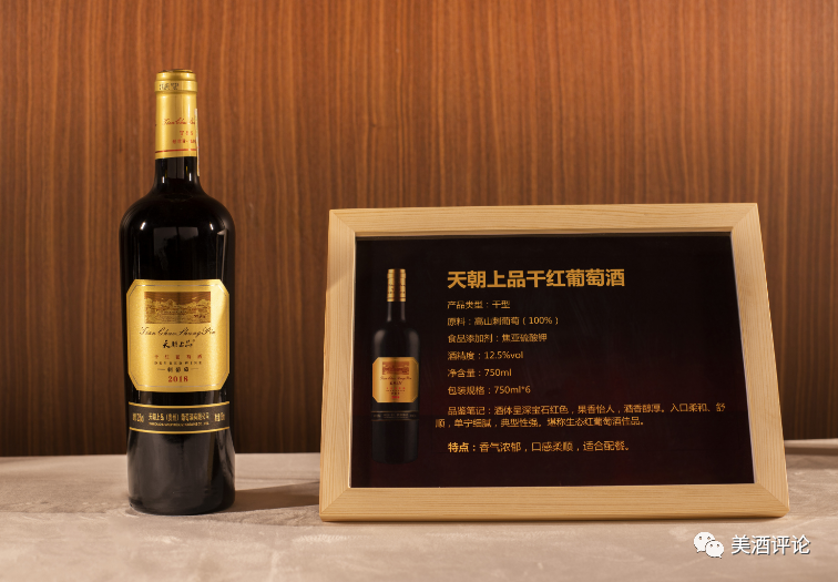 天朝上品干红葡萄酒(2018)具有浓郁的高山刺葡萄果香,色泽诱人,口感柔和,单宁适中,酸度协调。
