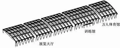 主馆纵向总长度为618m,横向尺寸为128m,纵向两端为附属功能用房,中部区域为超大跨主功能空间。主功能空间共分成5个独立结构单元,左边3个单元为单层展览大厅,第4、第5单元为训练厅和万人体育馆。训练馆和体育馆内部为独立的2层钢筋砼结构,在传力上与屋盖主体结构不发生关系。