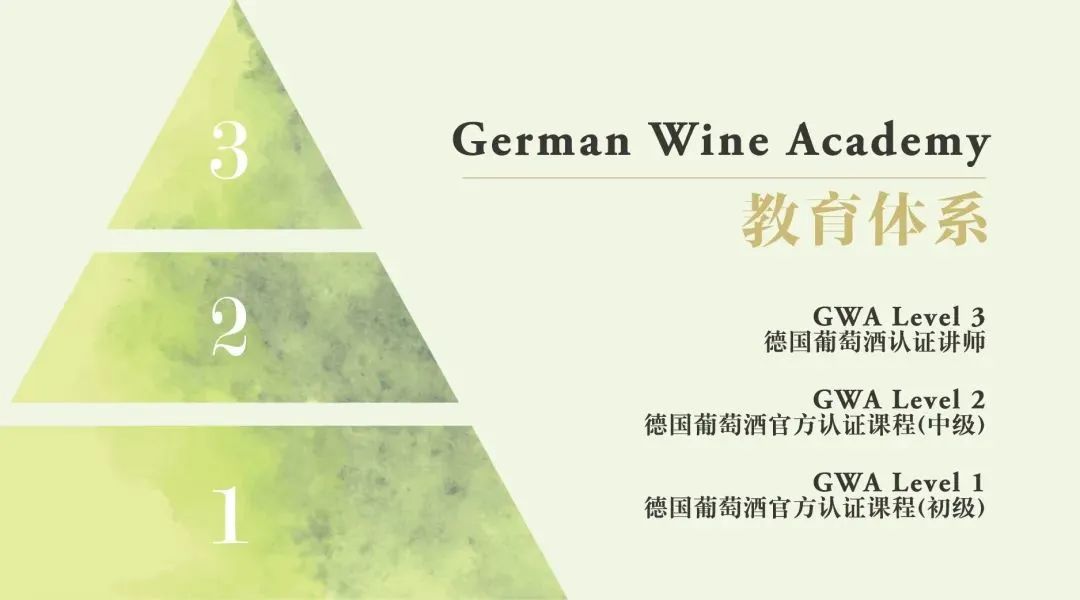 2017年度,德国葡萄酒协会正式推出 German Wine Academy 教育体系。该体系一共分为三个等级,分别为:GWA入门级别、GWA专业级别以及GWA认证讲师级别。