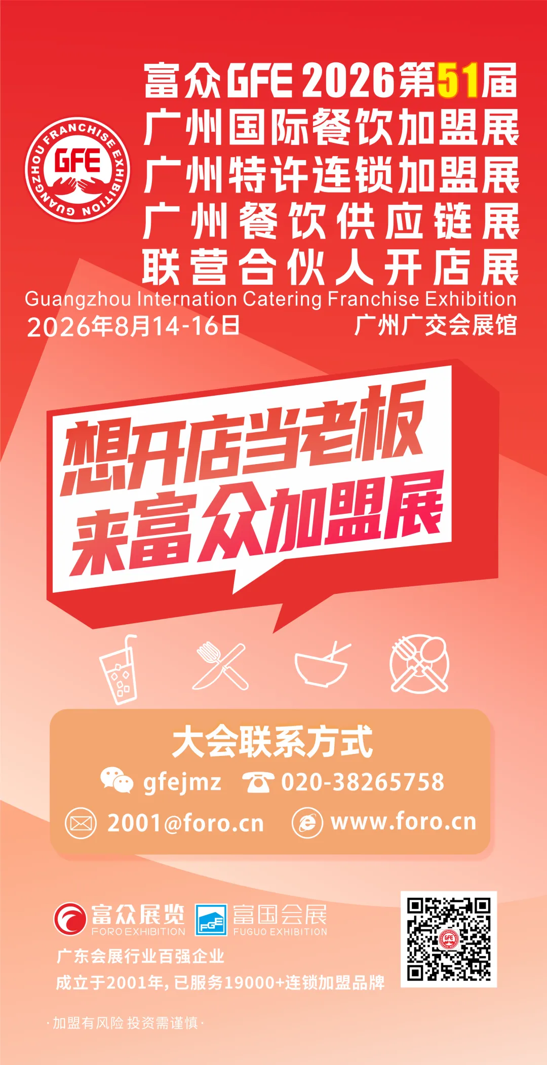 免责声明:加盟有风险,投资须谨慎。本公众号发布的所有内容,包括文字、图片、音频、视频等,为原创、来源第三方企业或部分来源网络。本公众号致力于好文推送,仅供用户浏览,但无法确保信息的完整性、即时性和有效性。并对文中观点保持中立,所发内容仅供学习、交流之目的,不做任何投资合作建议。投资者与品牌方达成的合作,本公众号及展会主办方不参与其中,不承担任何连带责任。观众可携带未成年儿童参观展会,但参观过程中若出现儿童走失、受伤或其他意外问题,由家长自行负责,主办方不承担任何责任。入场参观,即默认为同意认同接受以上条款。如不同意,请勿入场参观。戳“阅读原文”提前登记预约,获取参观GFE2026行业盛会入场二维码电子门票