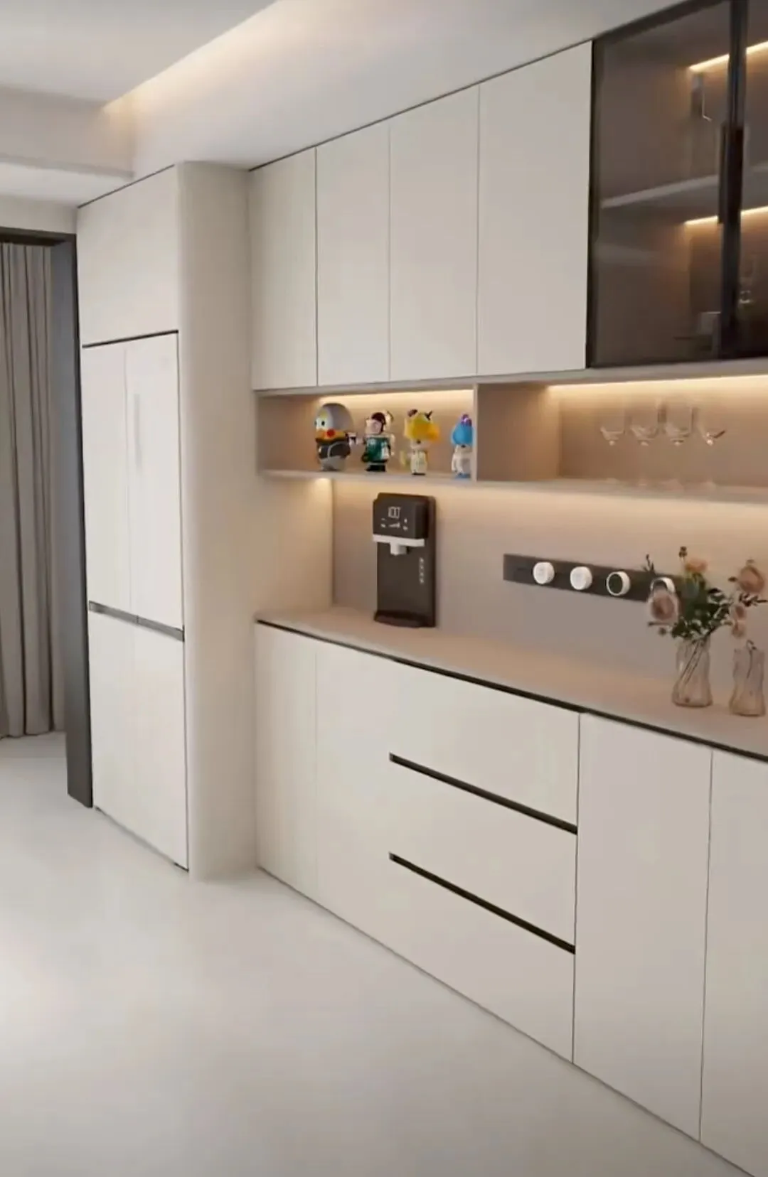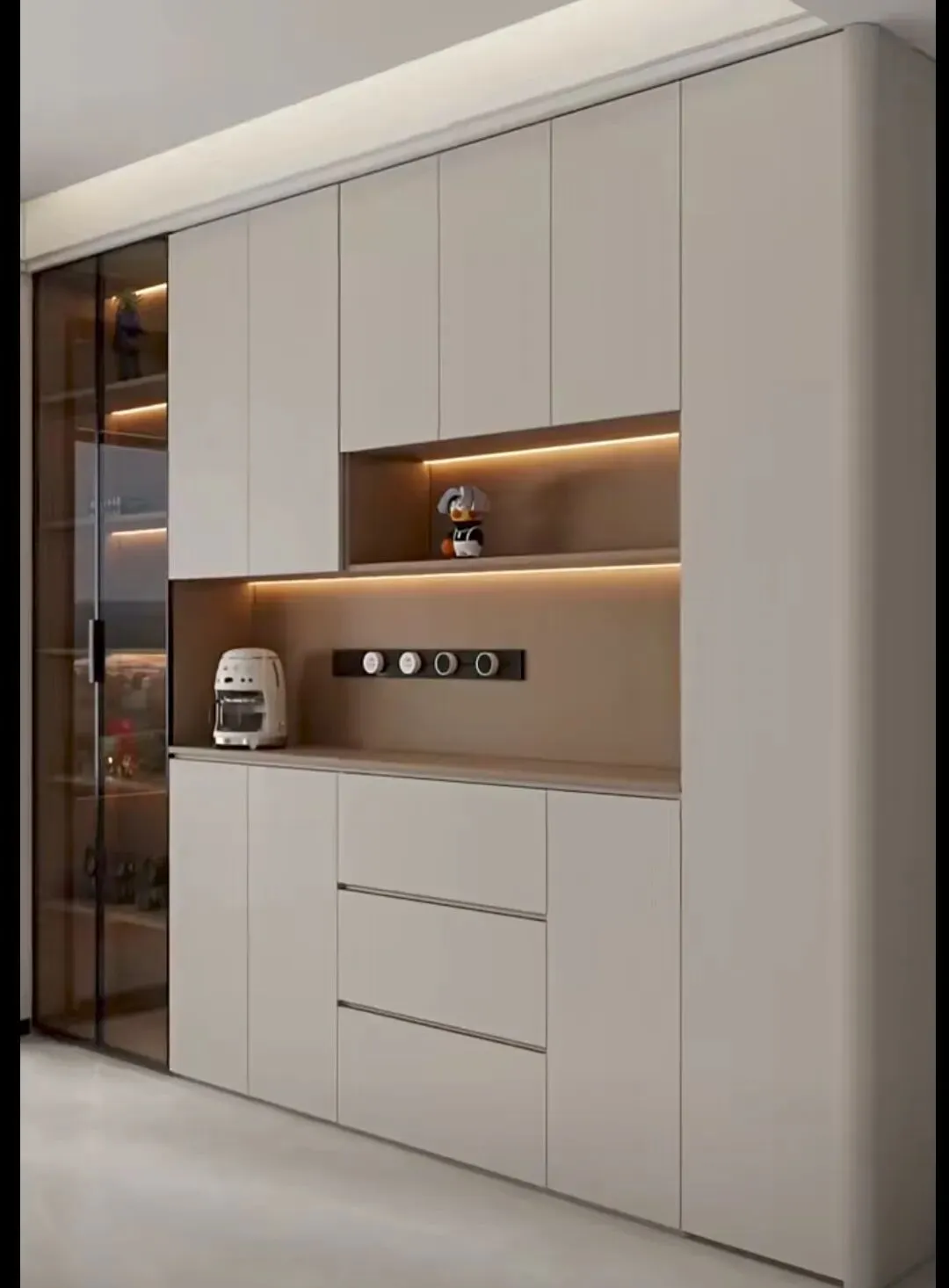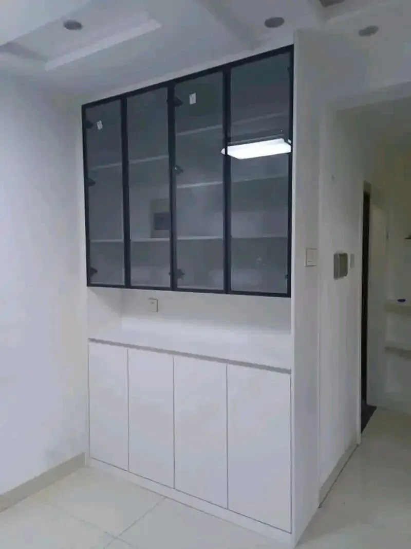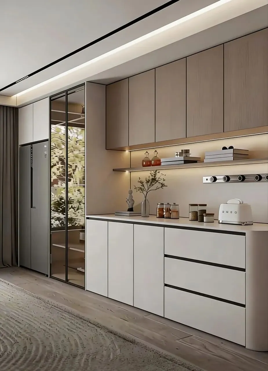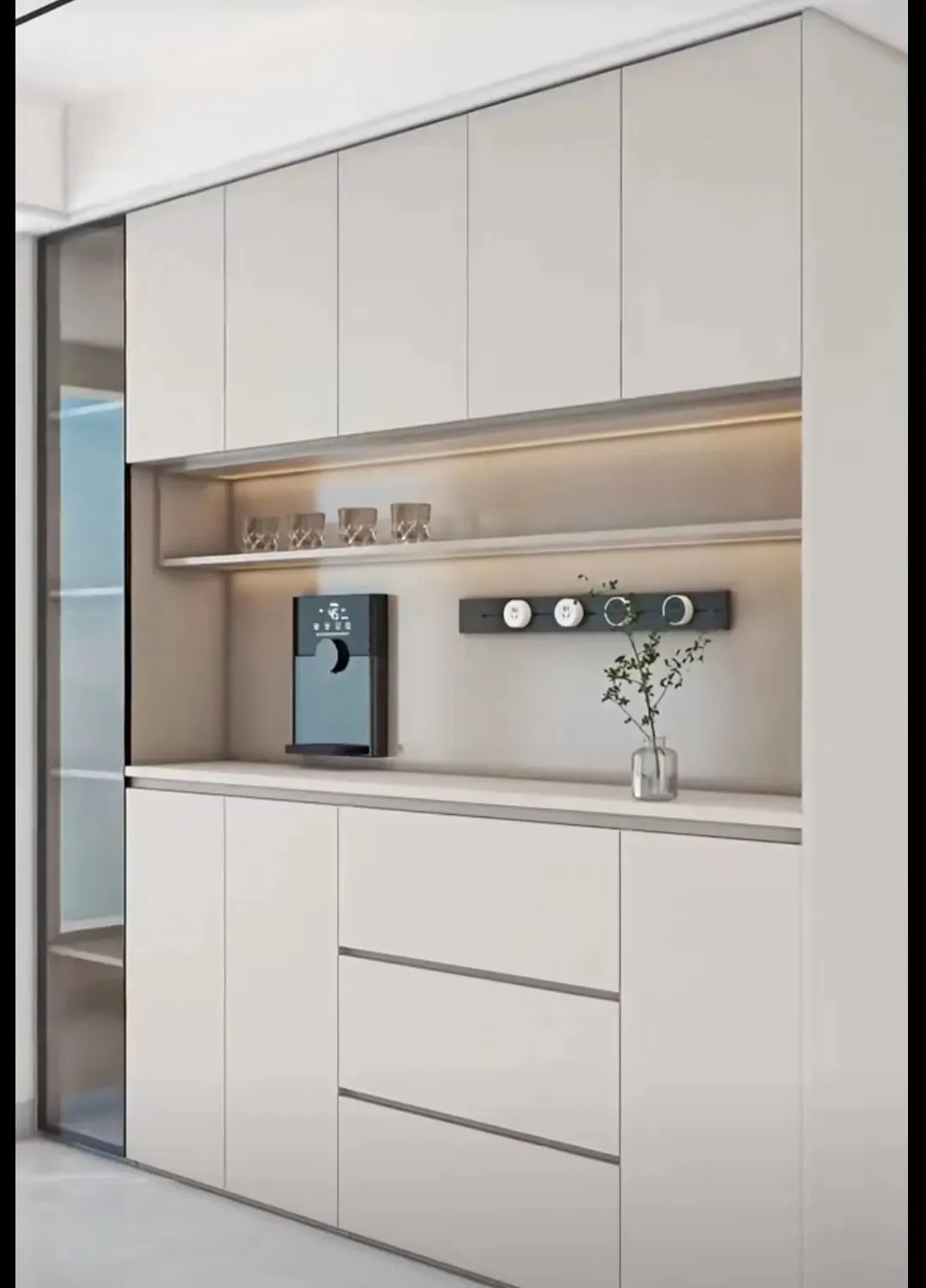 今年正确做法:玻璃门仅做小面积点缀,比如一侧窄柜、上层一小格,用来展示精致酒杯、藏品,点到为止更高级,别整面通玻。