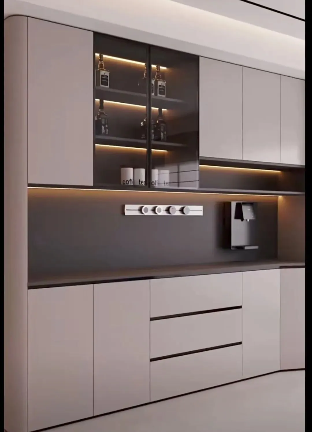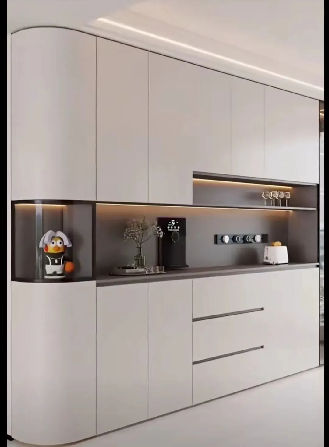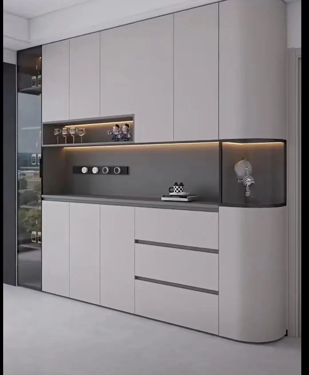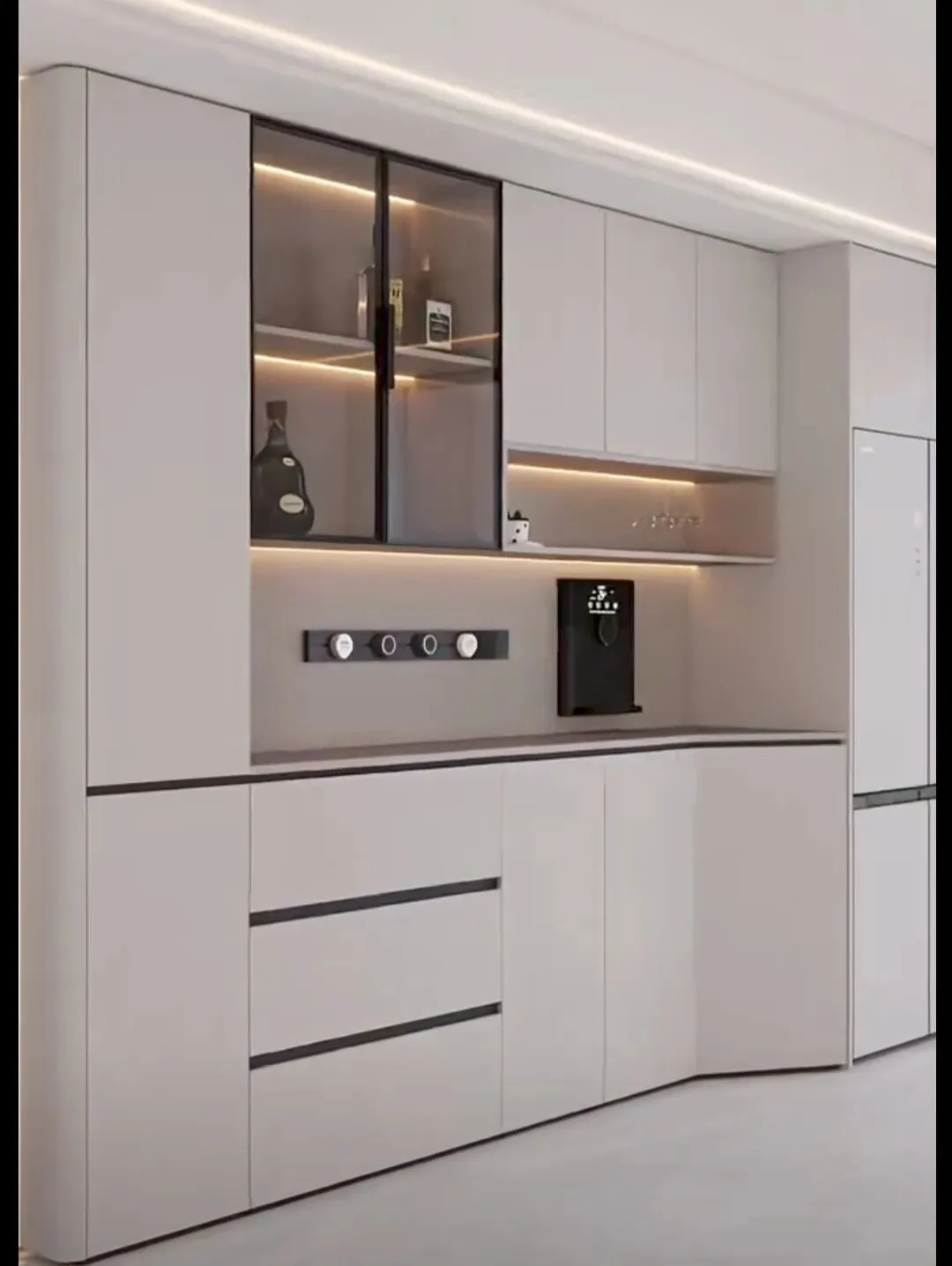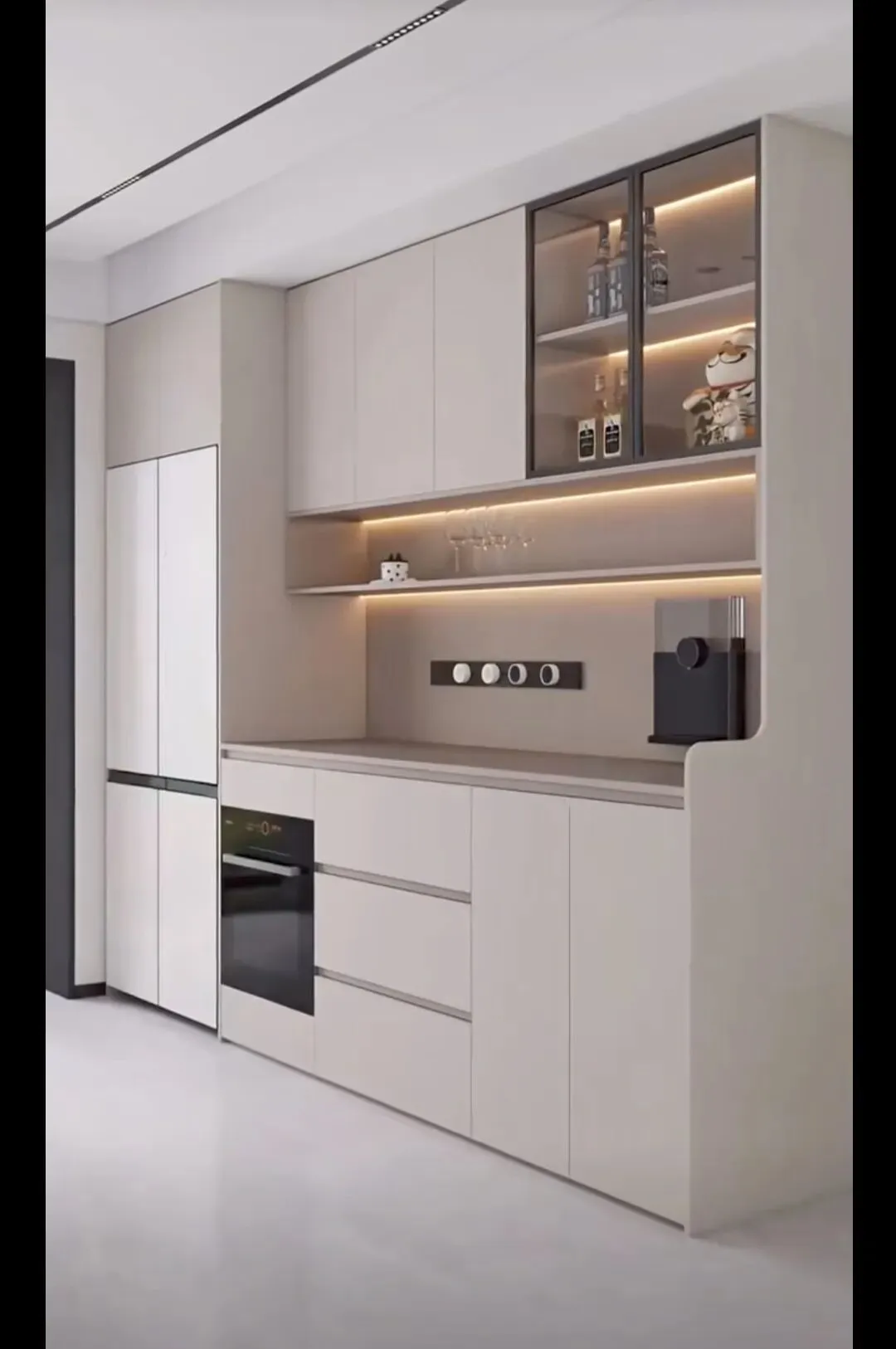 今年正确做法:玻璃门仅做小面积点缀,比如一侧窄柜、上层一小格,用来展示精致酒杯、藏品,点到为止更高级,别整面通玻。